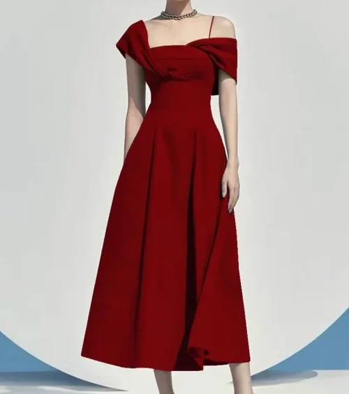 Product Name: Elegant Asymmetrical Shoulder Belt Sloping Shoulder Formal Party Red Dinner Evening Ladies Dress Formal 2023