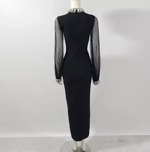 Product Name: Elegant Casual Black Chiffon Maxi Dress Diamond Patchwork Long Sleeves Zipper Decoration Natural Waistline Eco-Friendly Midi