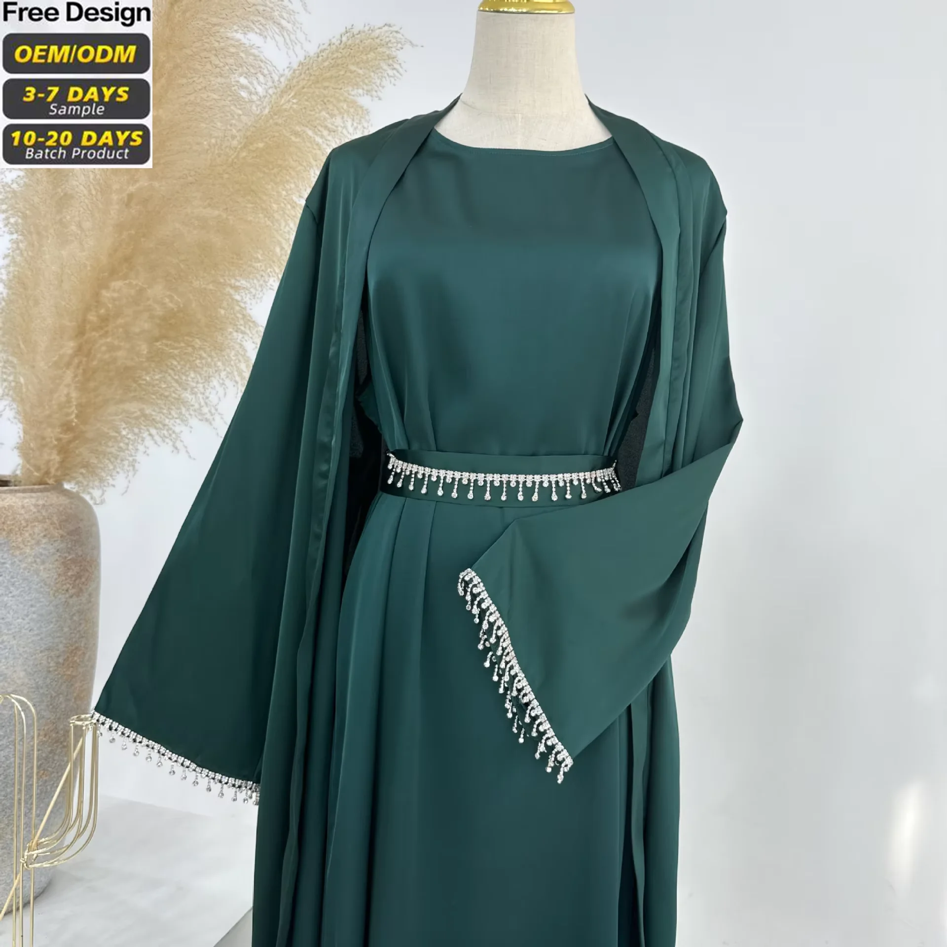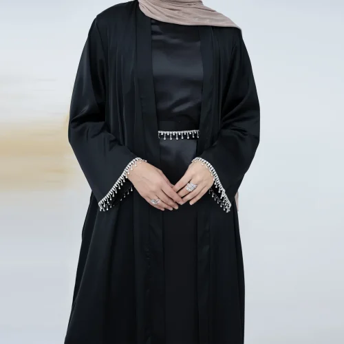 Elegant Casual Muslim Silk Open Abaya Dresses Solid Color Beaded Dress Gown Jubah EID Arab Islamic Cardigan Kimono Long Robe
