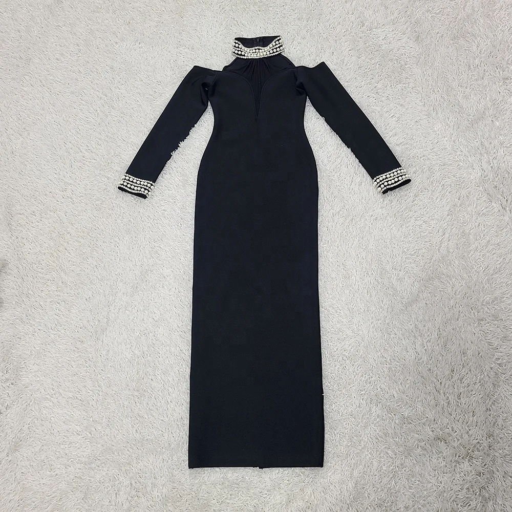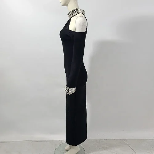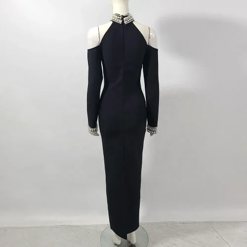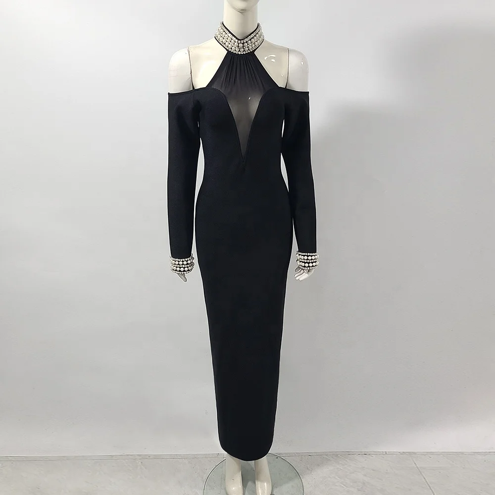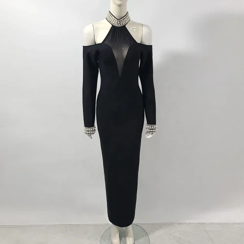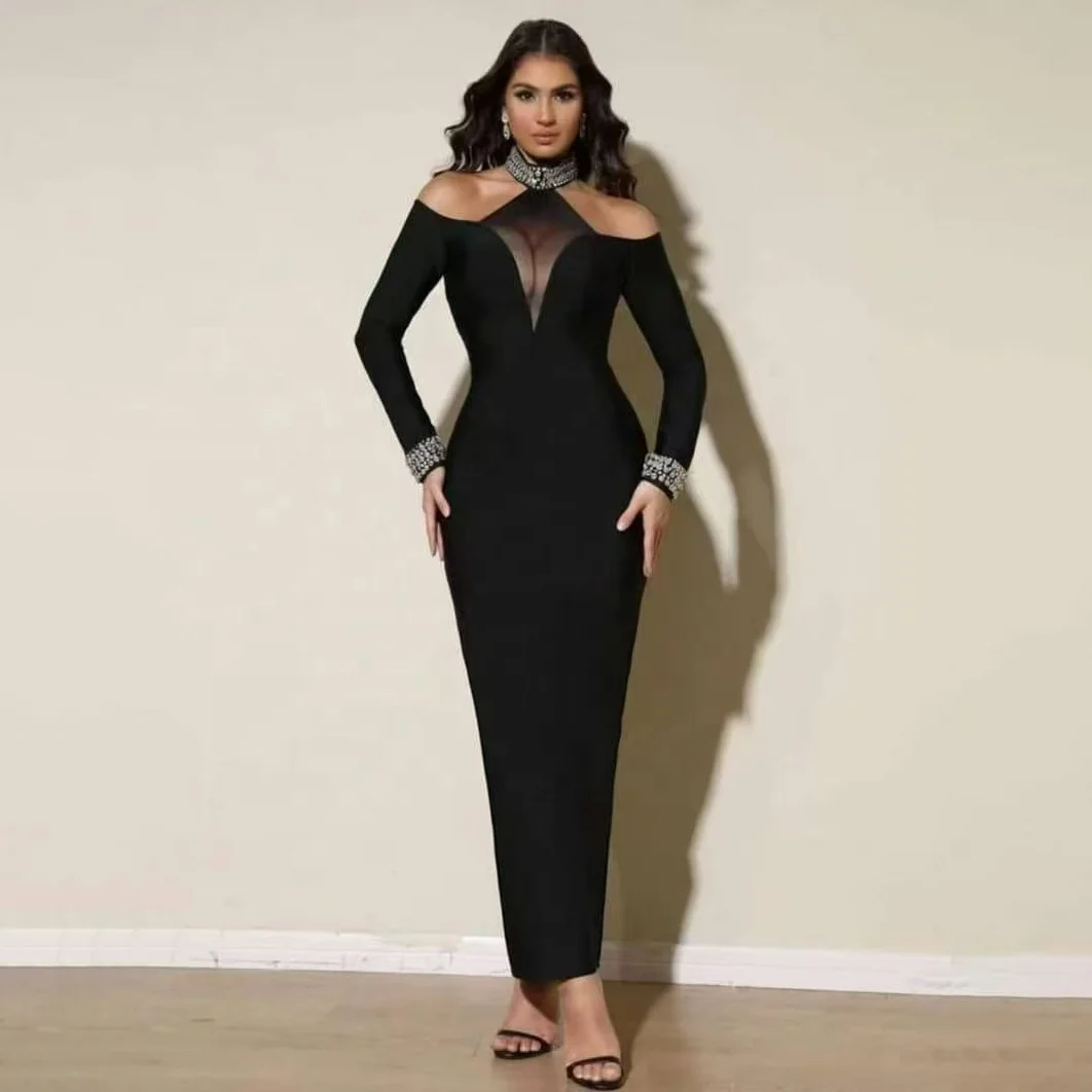 Elegant Diamond Mesh Off the Shoulder Long Sleeve Sexy Bandage Maxi Dress for Women Evening Party Gown Autumn Winter New