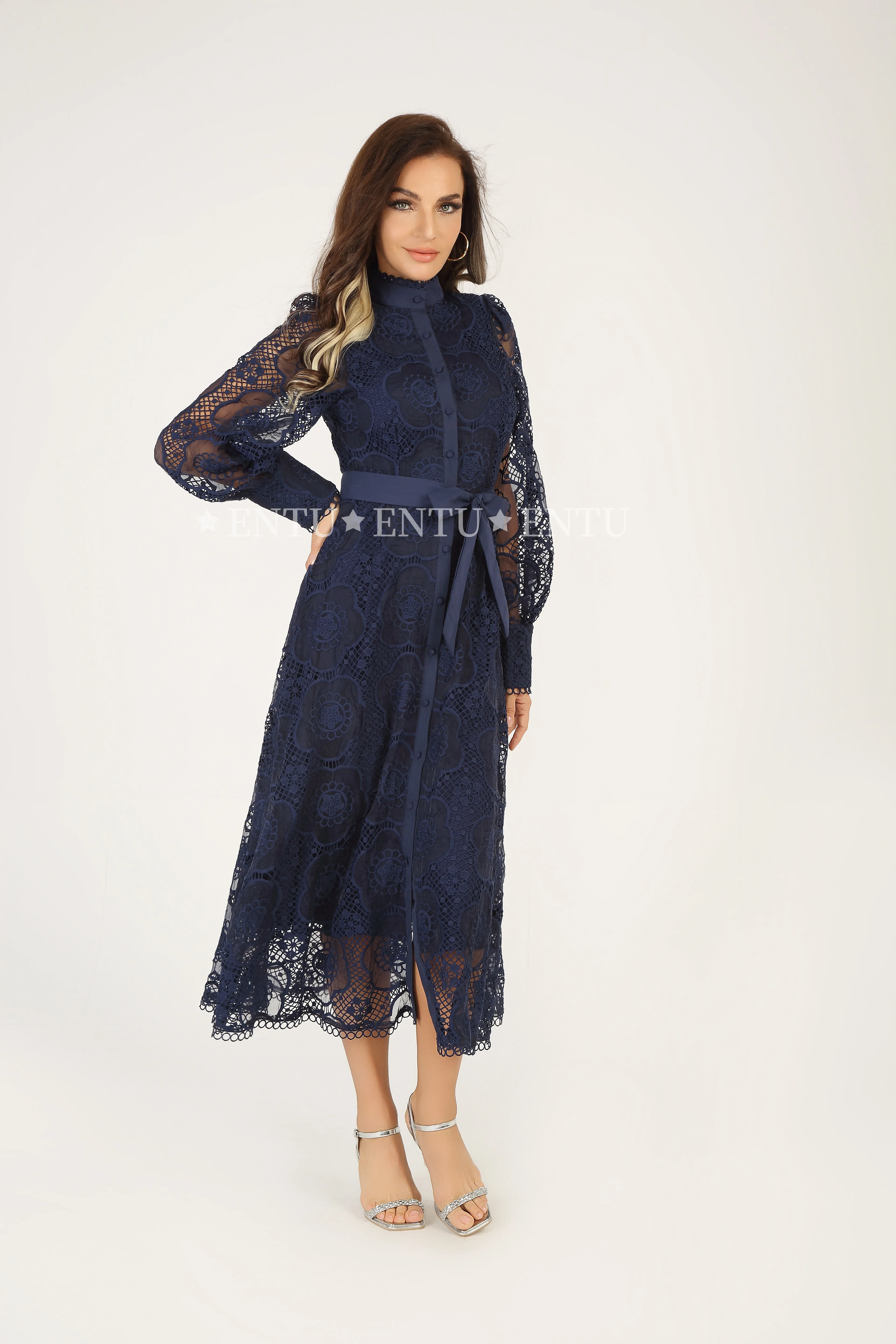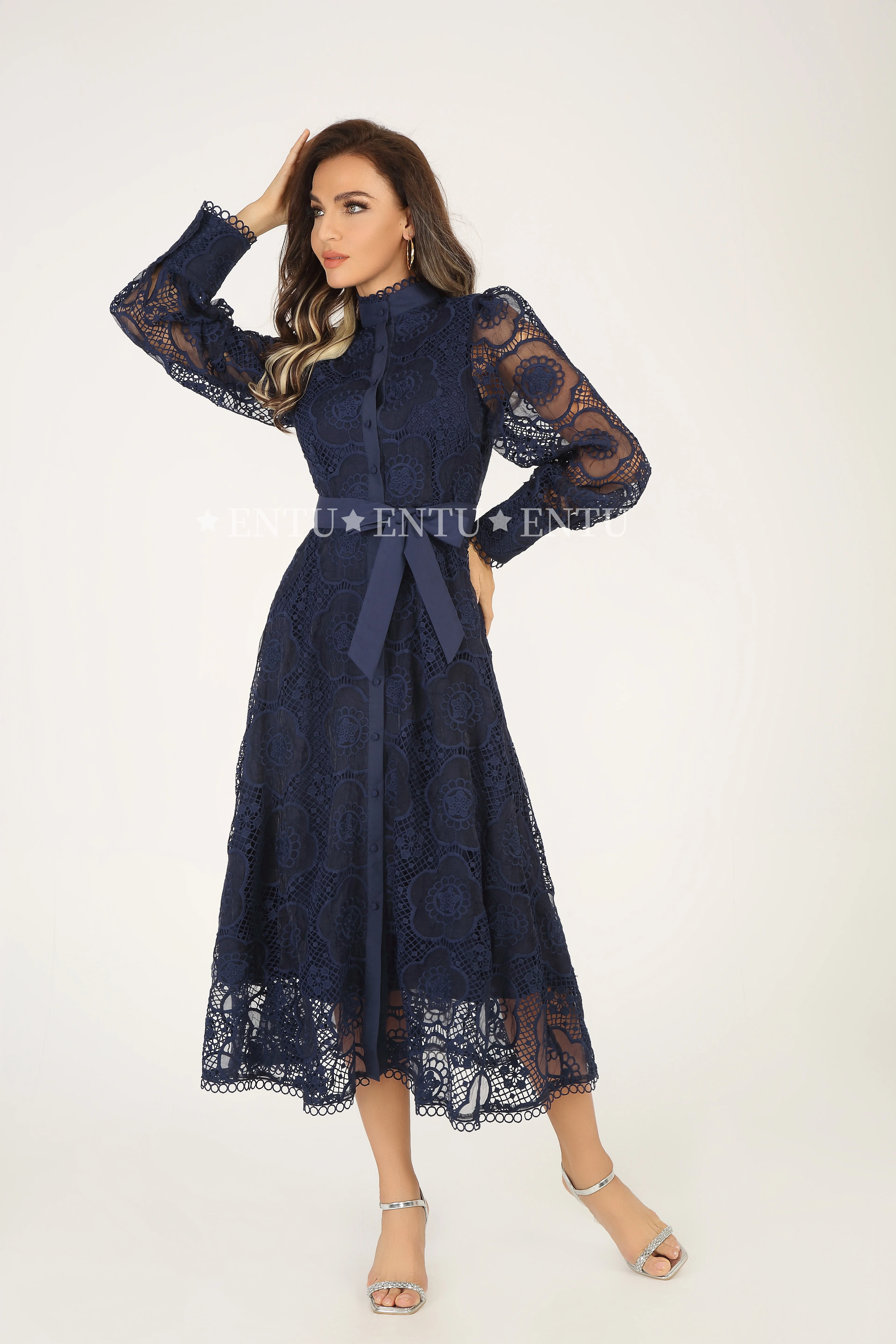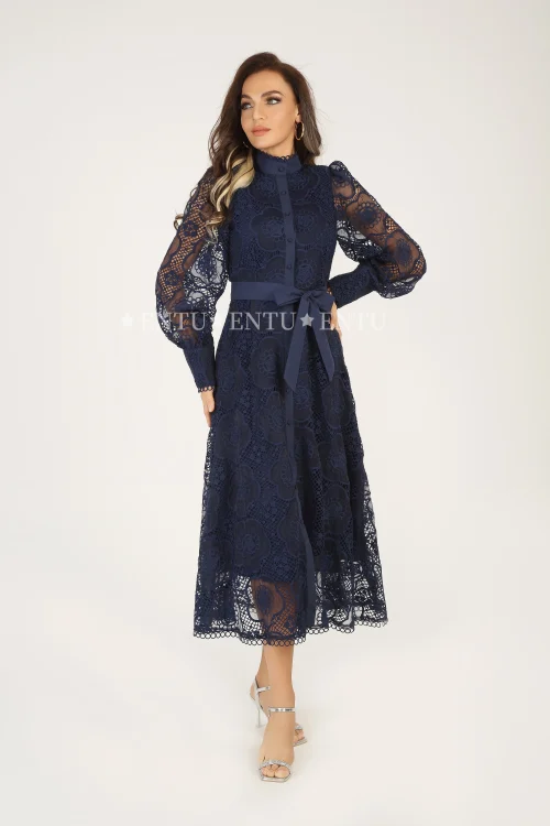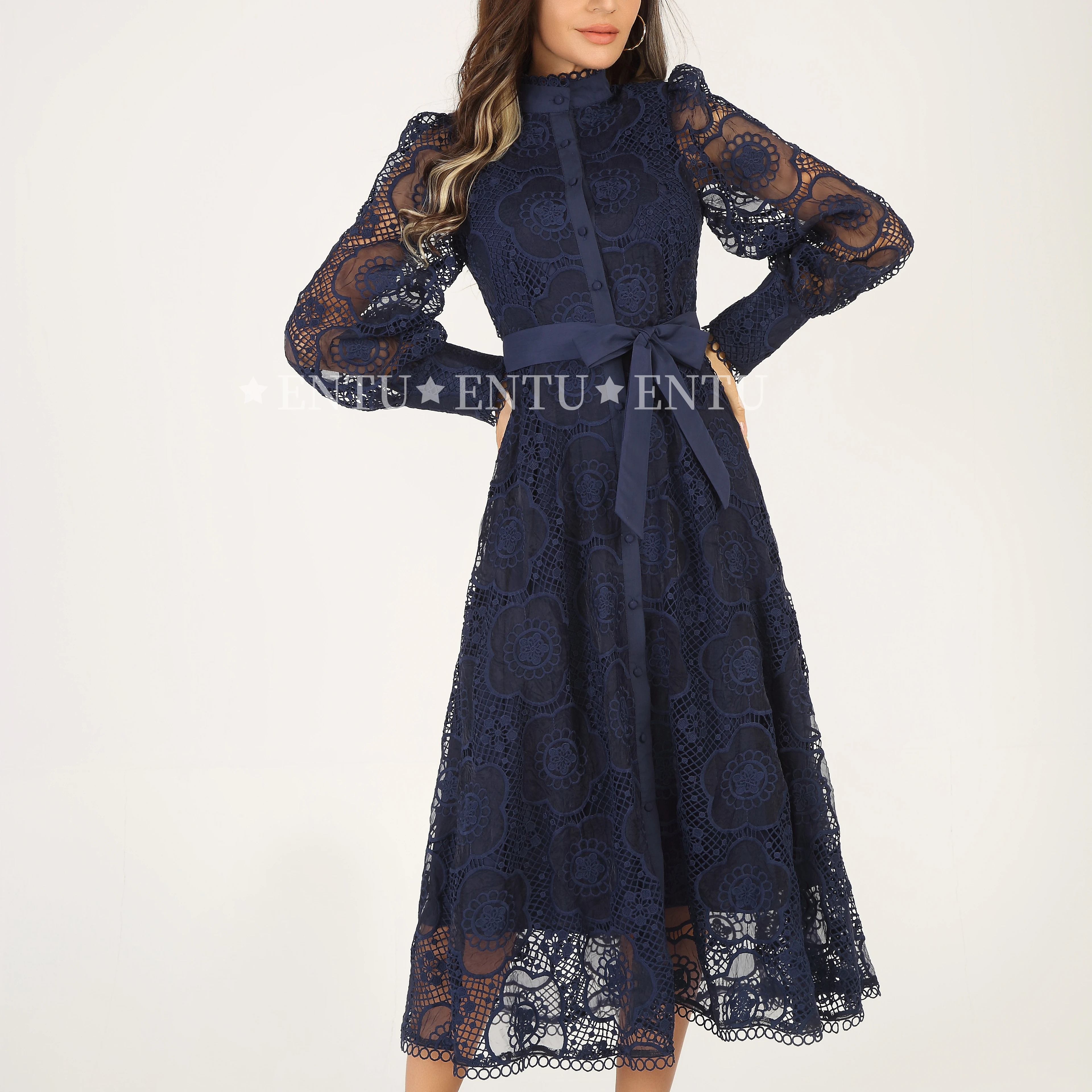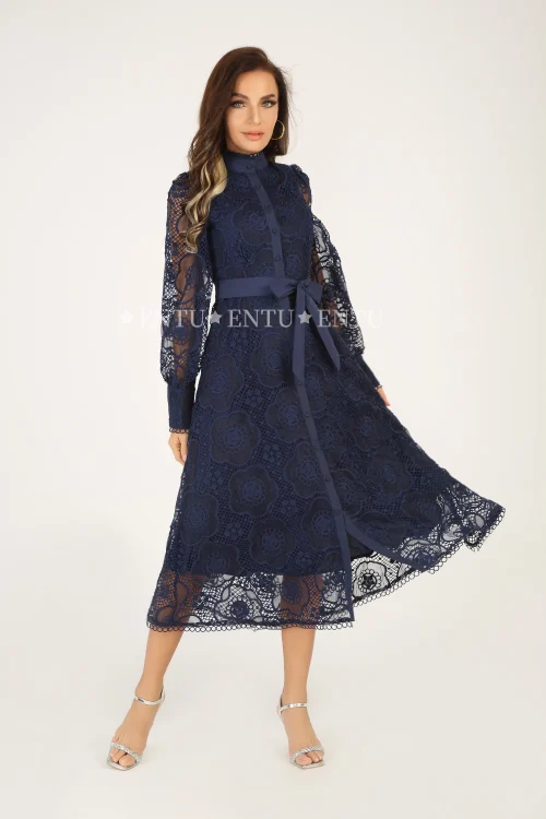 Elegant Fashion Lace Evening Party Dress Women Single Breasted Placket Sleeved Casual Career Dresses With Belt