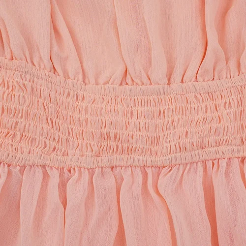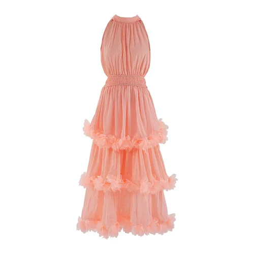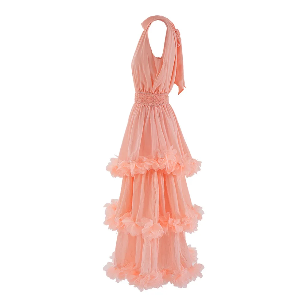 Elegant Ladies Casual Dress Autumn New Sleeveless Waist Tight Cake Design Multi-Level Pleated Mesh Solid Pattern Sexy Ear-rimmed