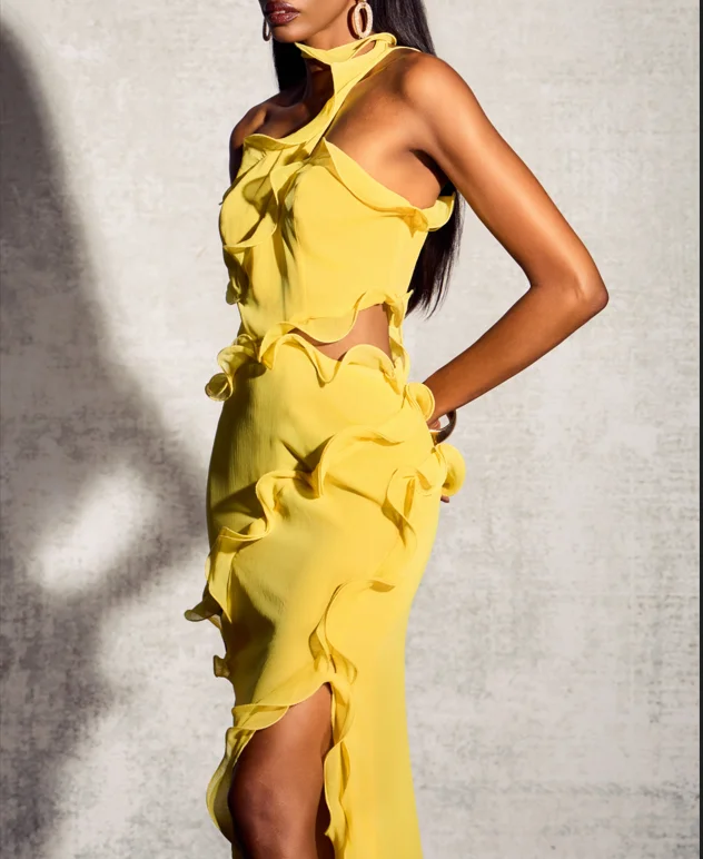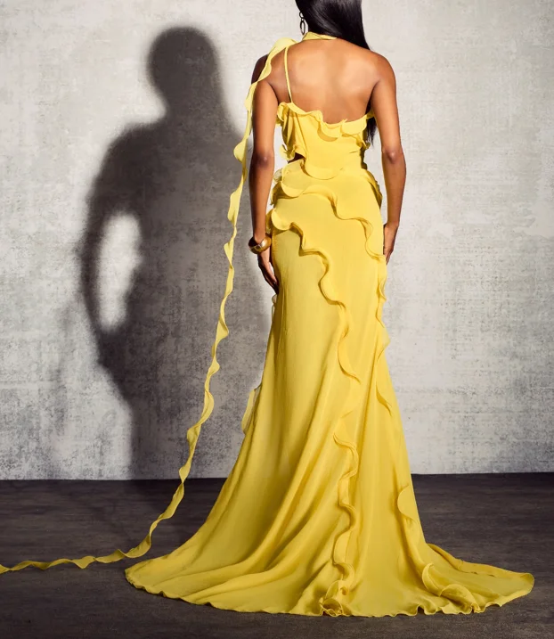 Product Name: Elegant Style One Shoulder Formal Dress 2025 Flounce Hem Slit Evening Dress Yellow Halter Chiffon Maxi Beautiful Dress