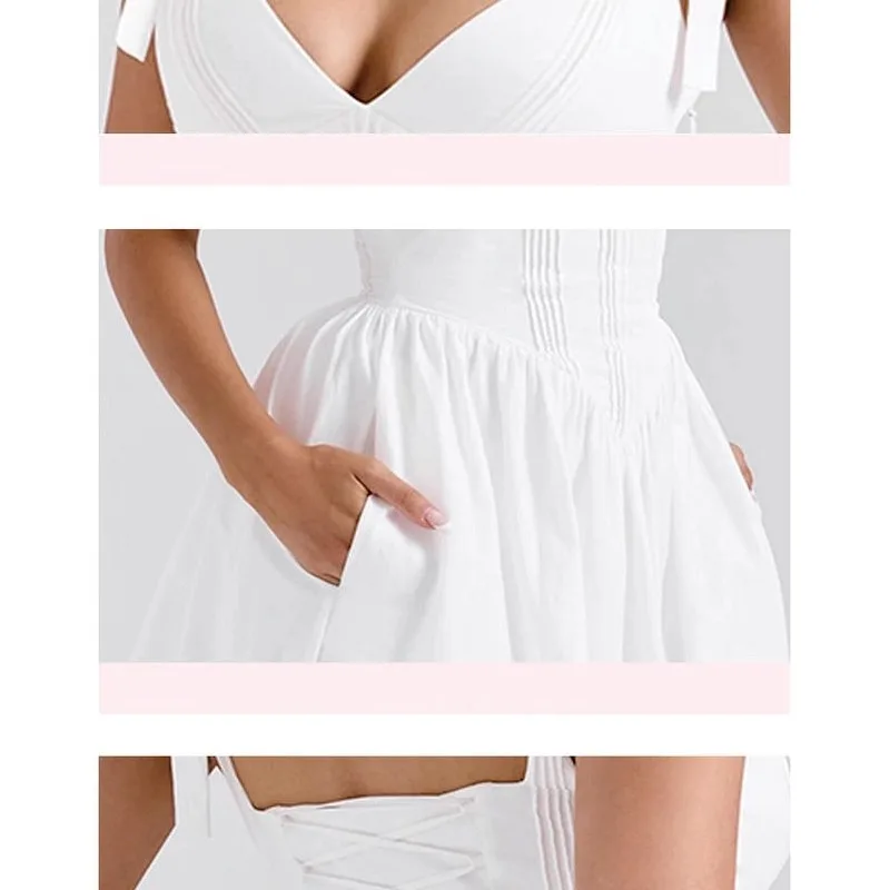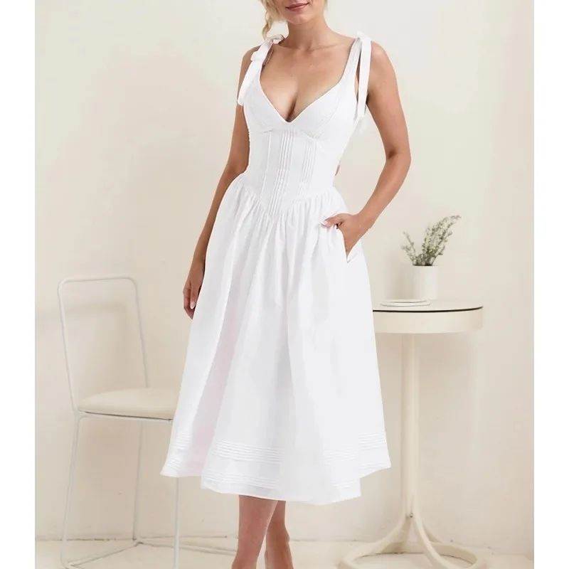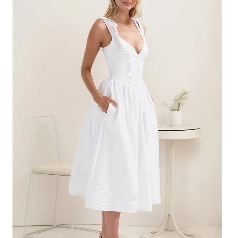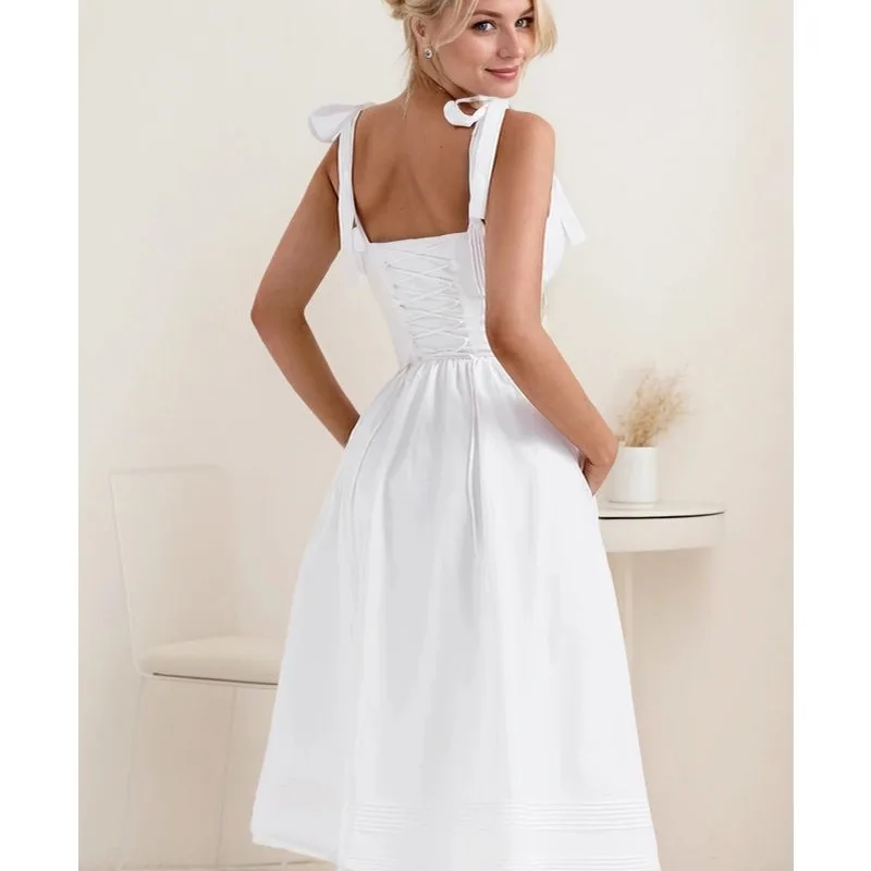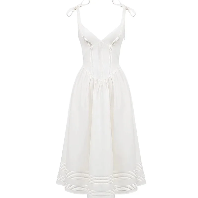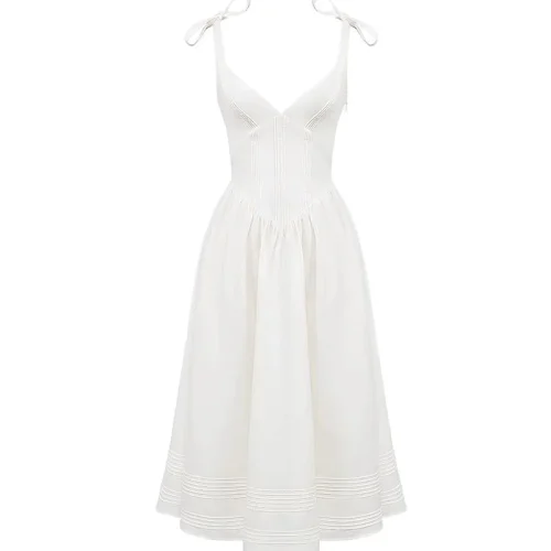 Elegant Timeless White Pin Tuck Midi Sundress Women’s Clothing Floral Breezy Style Woven Chiffon Natural
