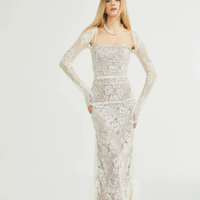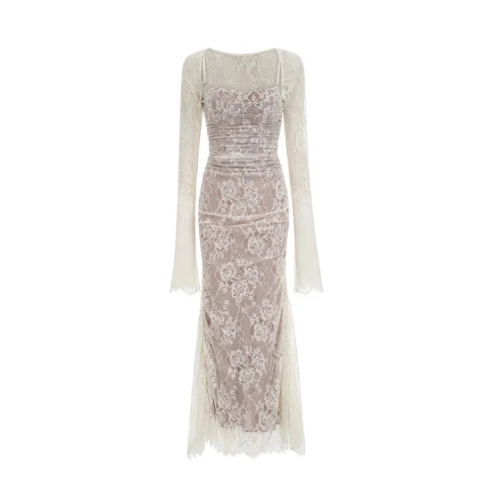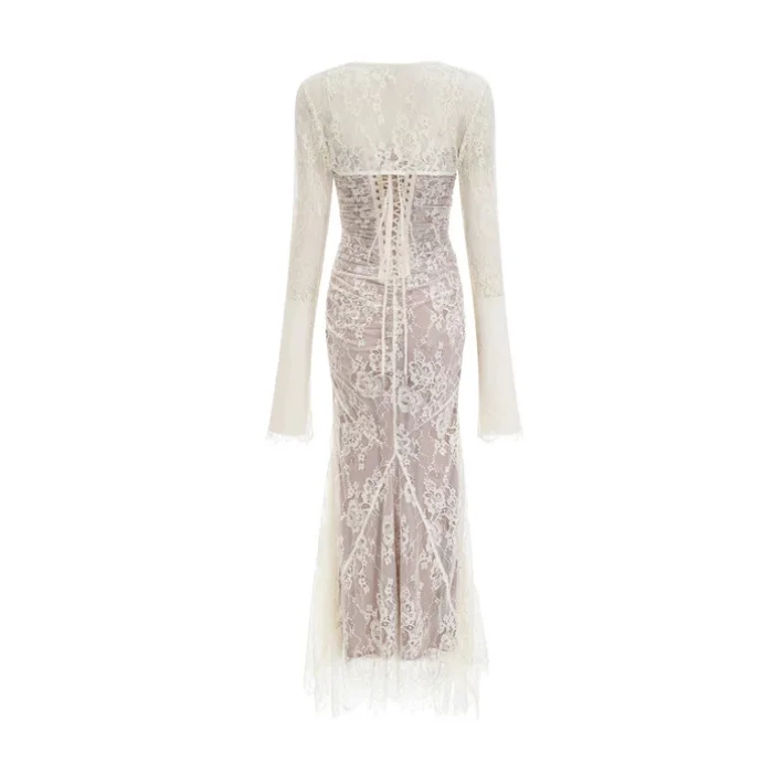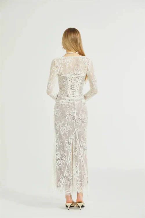 Product Name: Elegant Women’s 2024 Summer White Formal Evening Dress with Lace Decoration Natural Waistline Woven Technique Plain Dyed