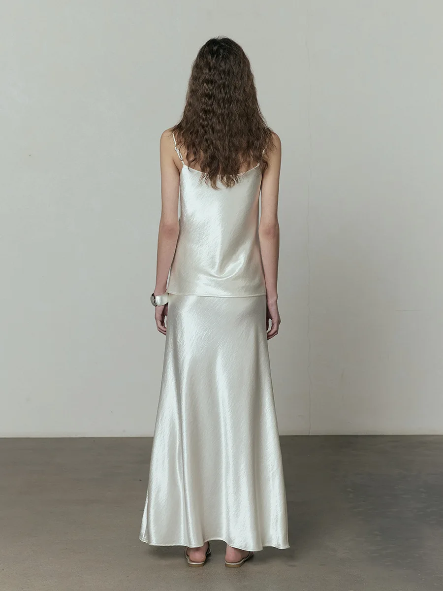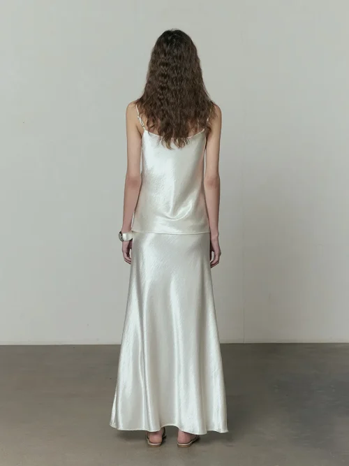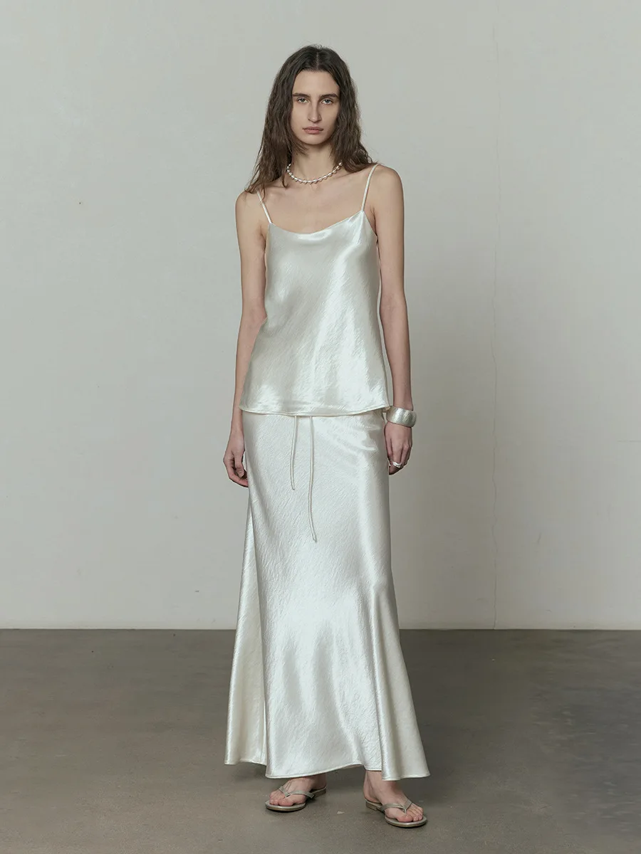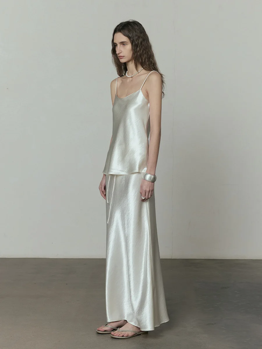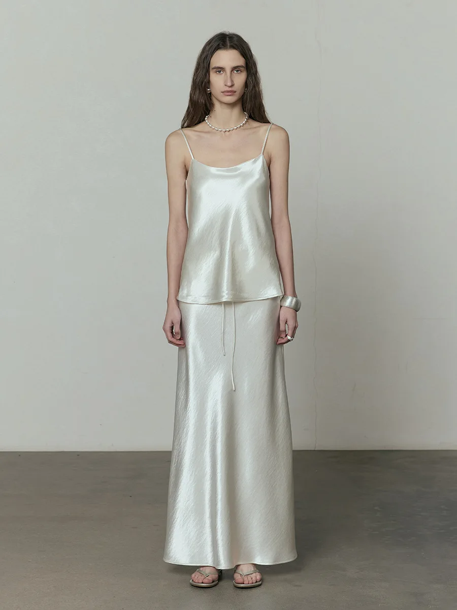 Product Name: Elegant Women’s Beige Satin Maxi Skirt High Waist A-Line with Lace-up Breathable Silk Long Skirt