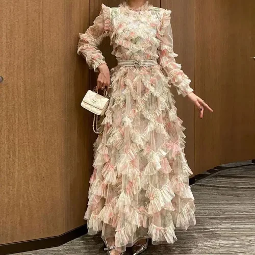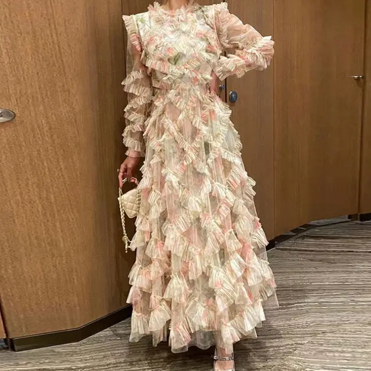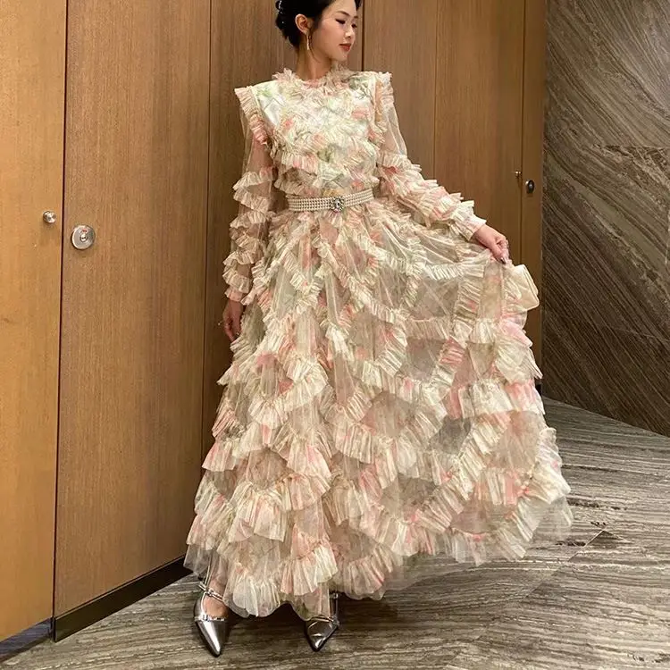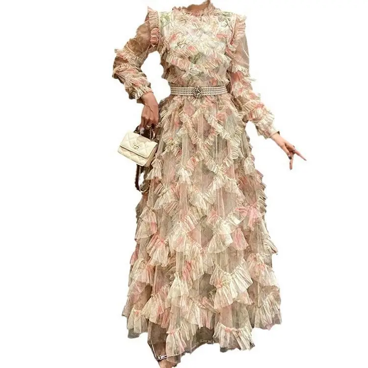 European American Evening Woman Dress Fresh Fairy Style with Black Fungus Edge Flower Embroidery for Spring