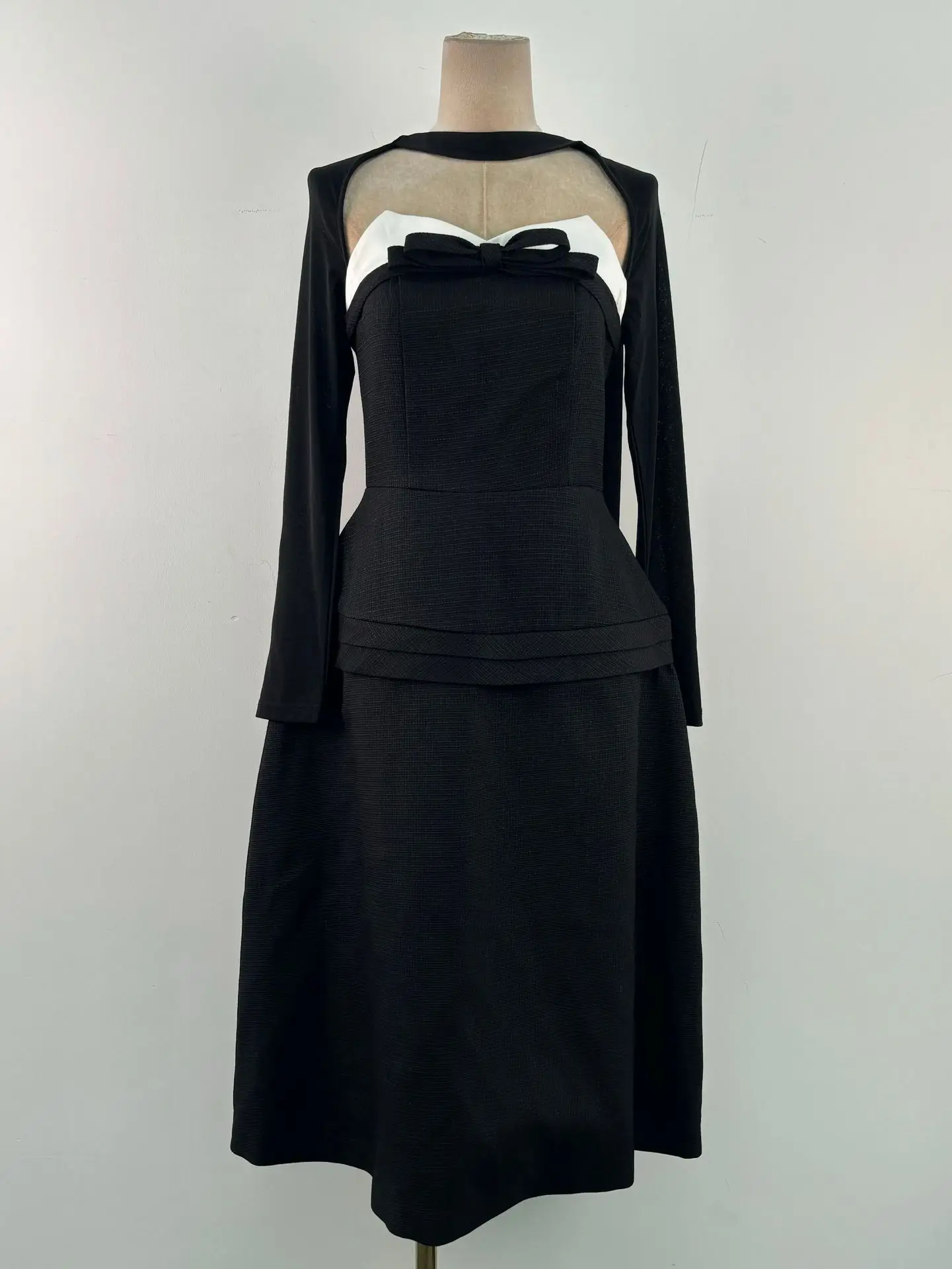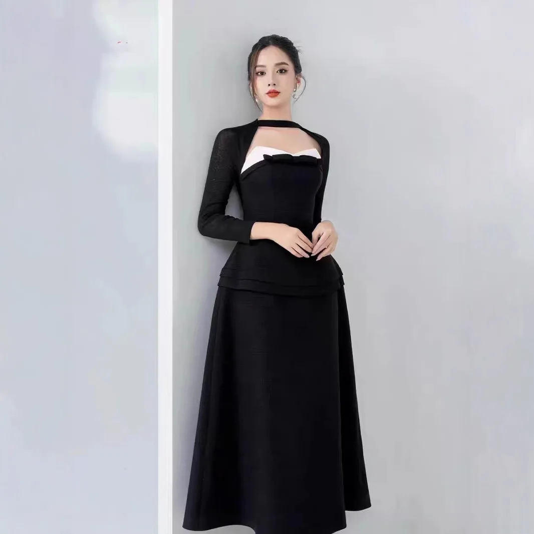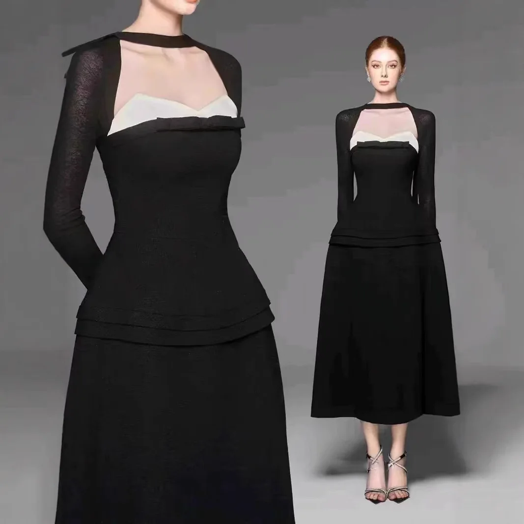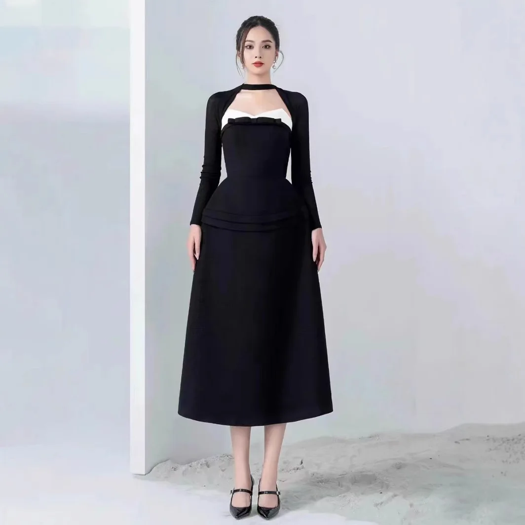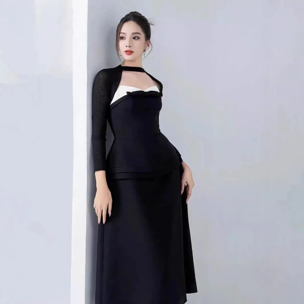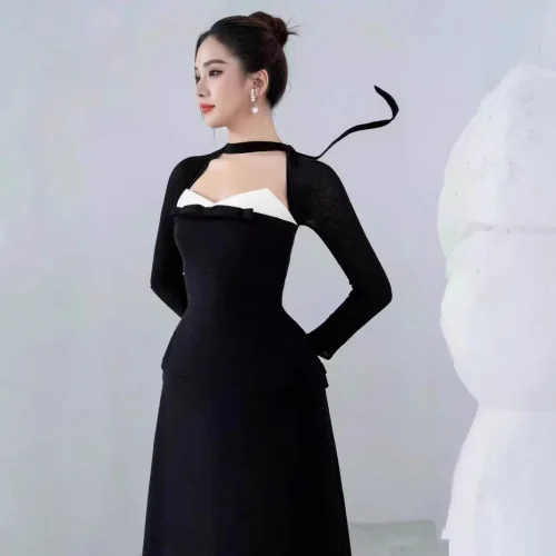Product Name: Fashion Temperament Bow Contrast Color Two-piece Dress Senior Sense Halter-neck Long Black Dress