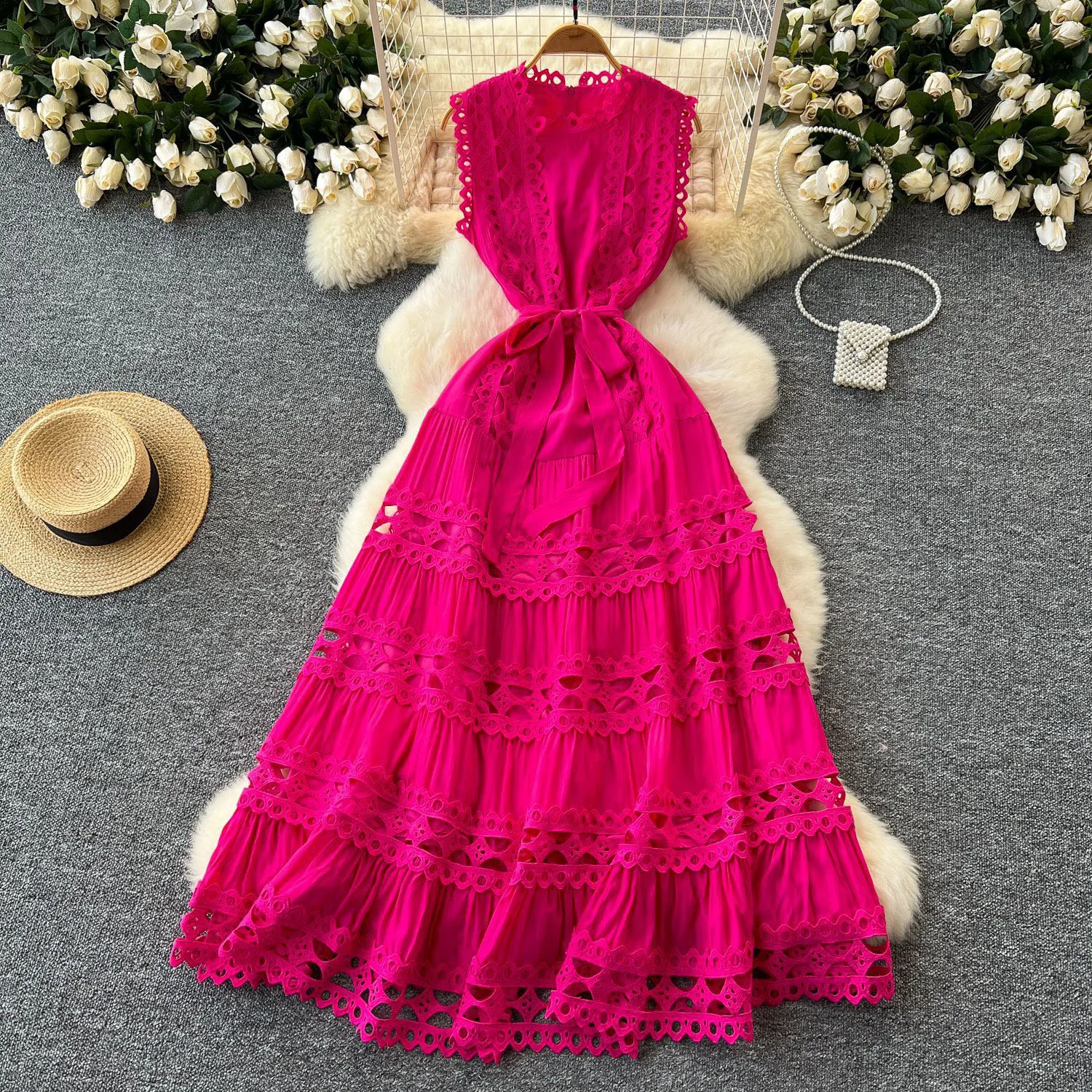 Product Name: Fashionable and Elegant O-neck Sleeveless Lace Hollow Edge Splicing Layered Skirt Long Dress