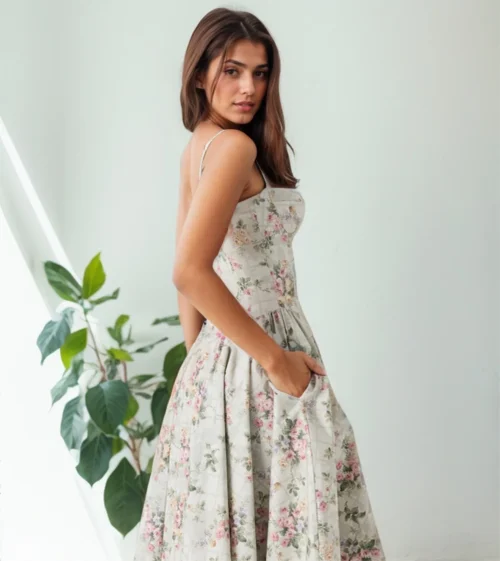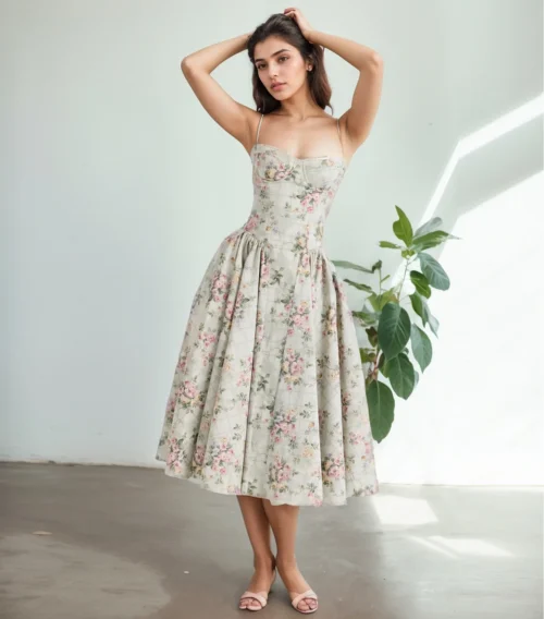 Product Name: Floral Print A-Line Midi Dress for Women Elegant Summer Sundress with Slender Fit and Spaghetti Strap Sleeves