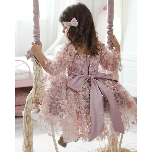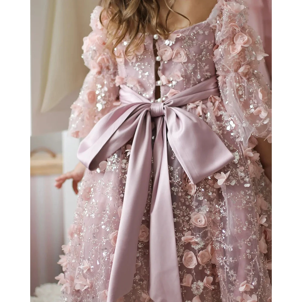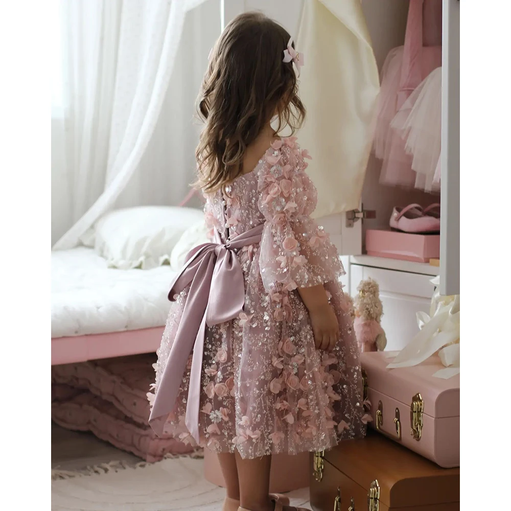 Product Name: Gorgeous Pink Sequin 3D Flowers Kids Princess Girl Dress Half Sleeves Knee Length Girls Party Dresses for Wedding