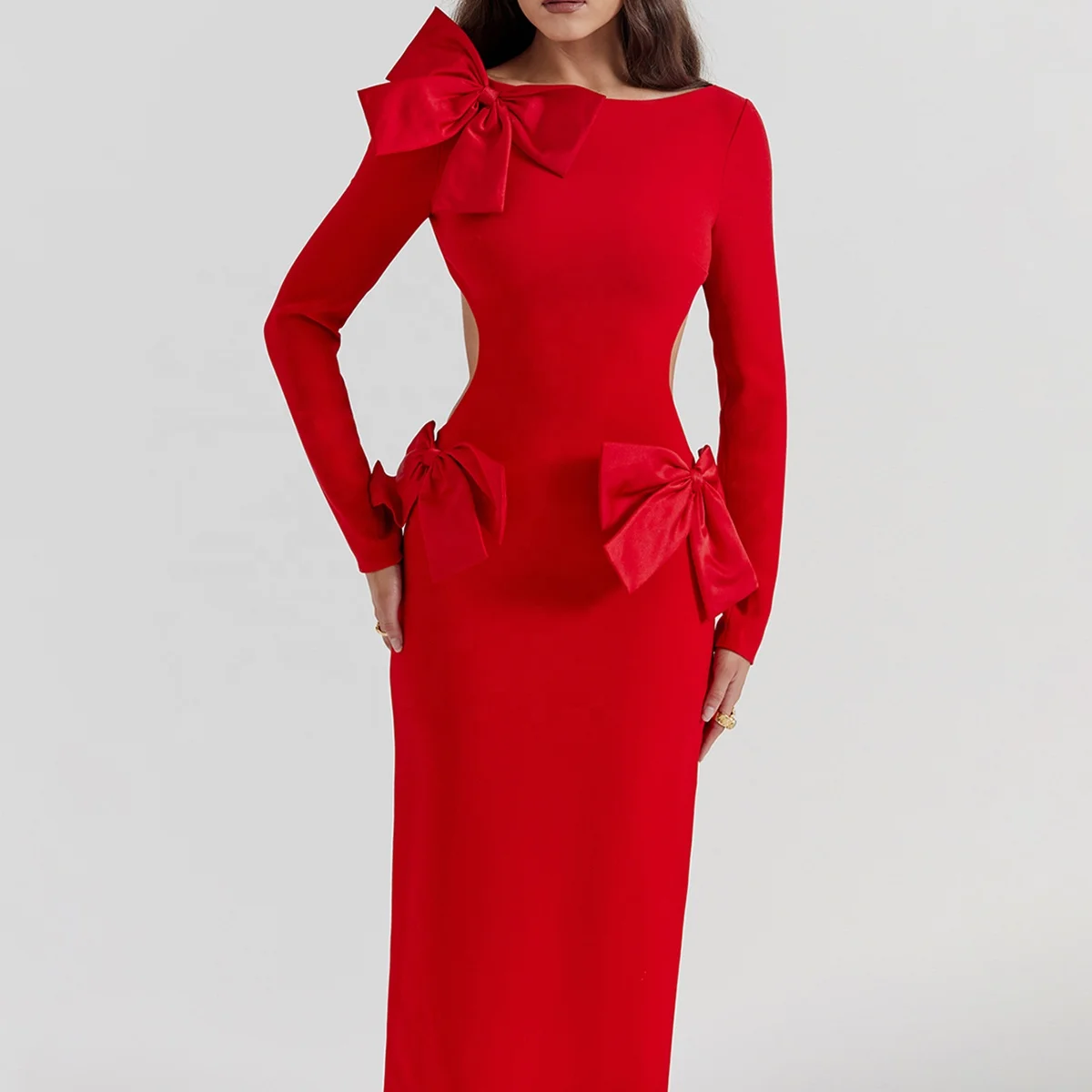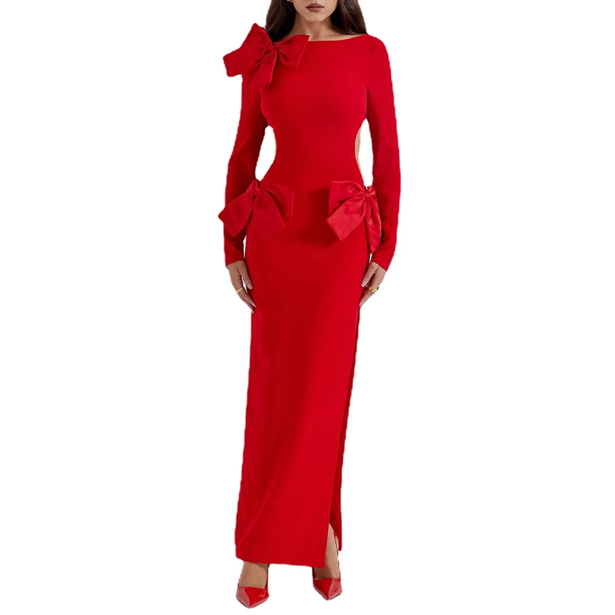 Product Name: GS Elegant Red Bow Maxi Dress – Eye-Catching Formal Attire for Red Carpet Events