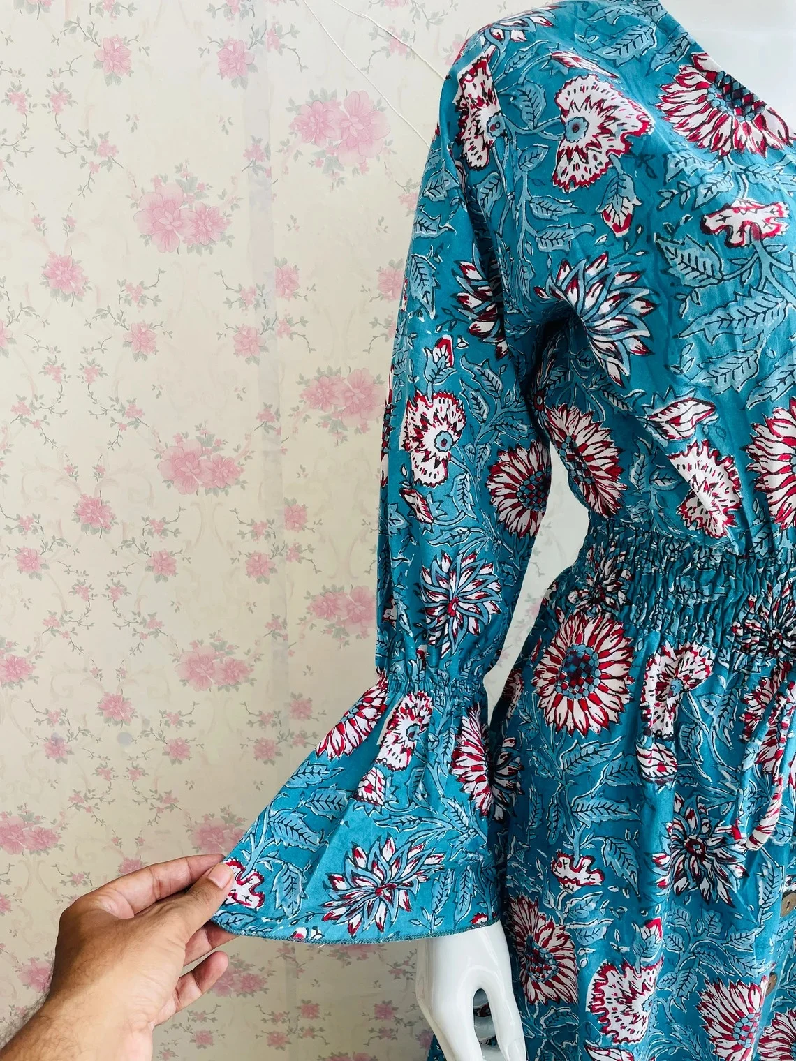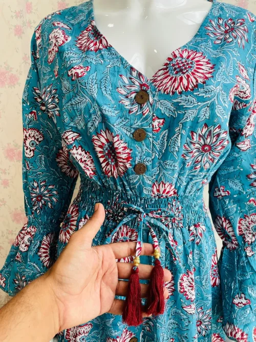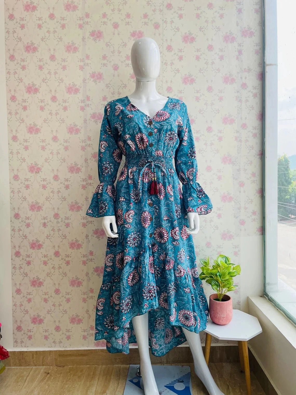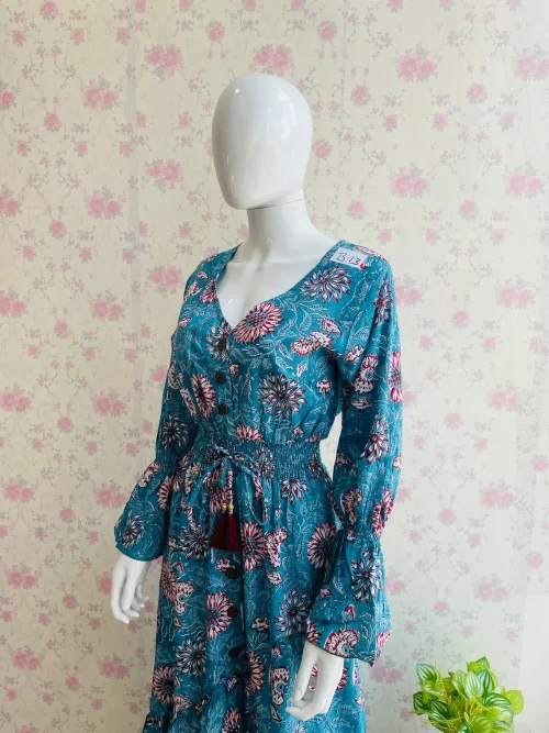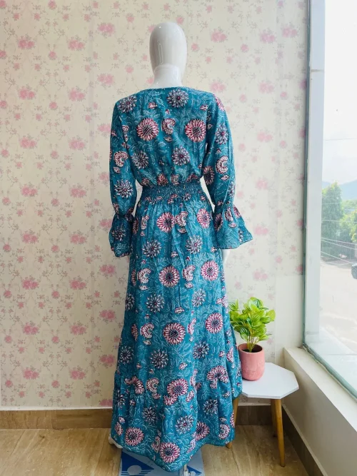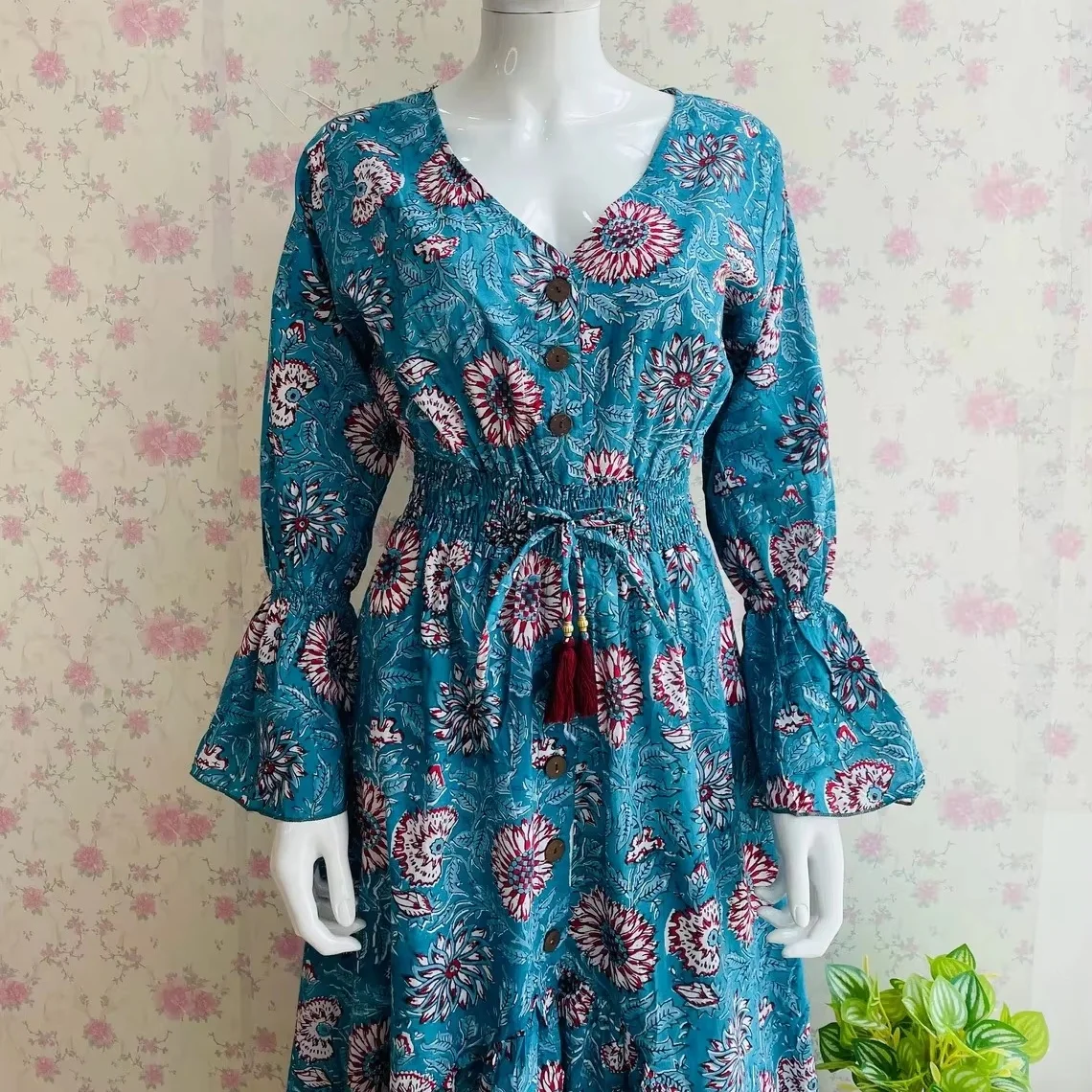 High Quality Cotton Maxi Button Dress Women V-Neck Party Dress Digital Printing Hand Block Print Woven Weaving Breathable Autumn