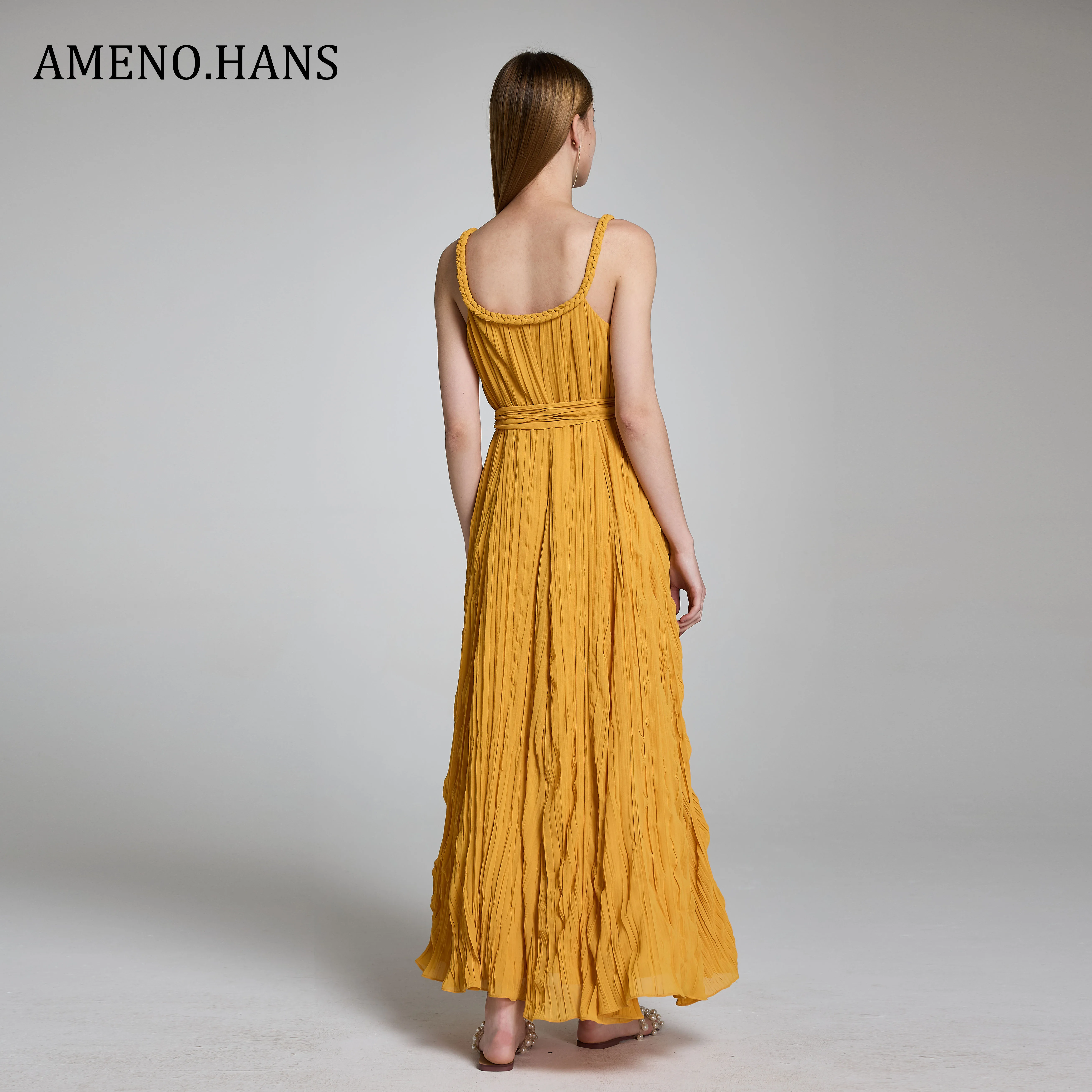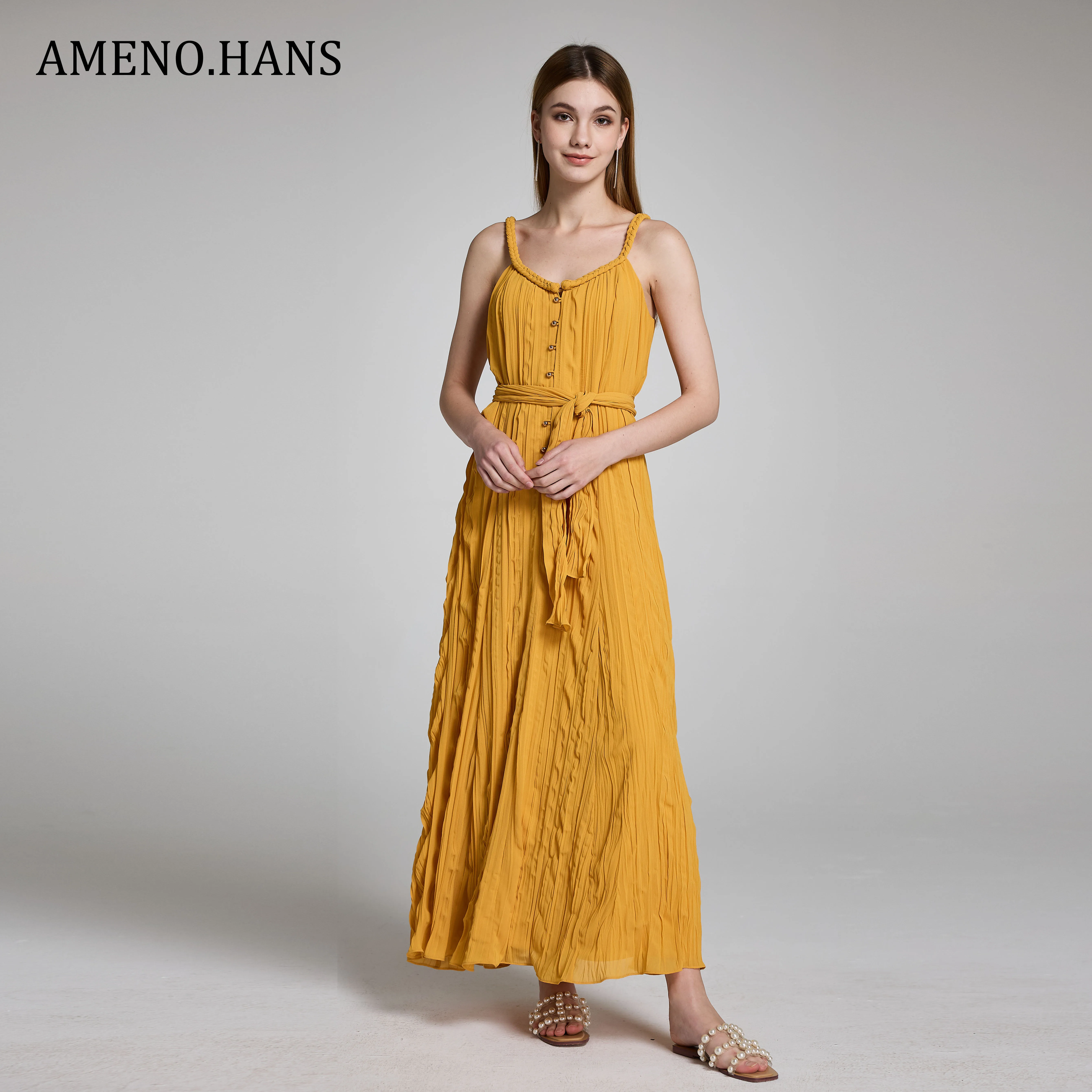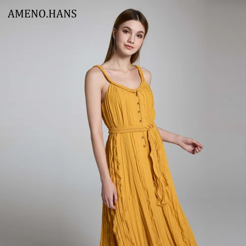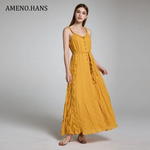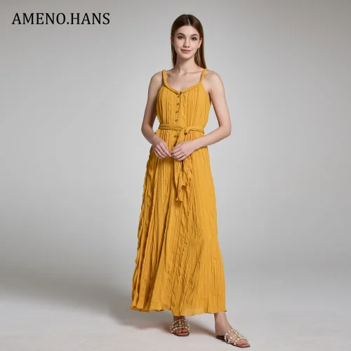 High Quality Ladies Pleated Casual Summer Solid Color Sashes Sundress Beach Maxi Dresses