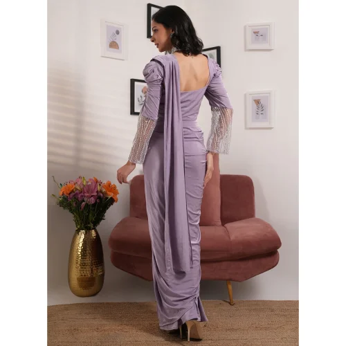 Lavender Embroidery Work Lycra Saree Wedding Ready-to-Wear Evening Dress