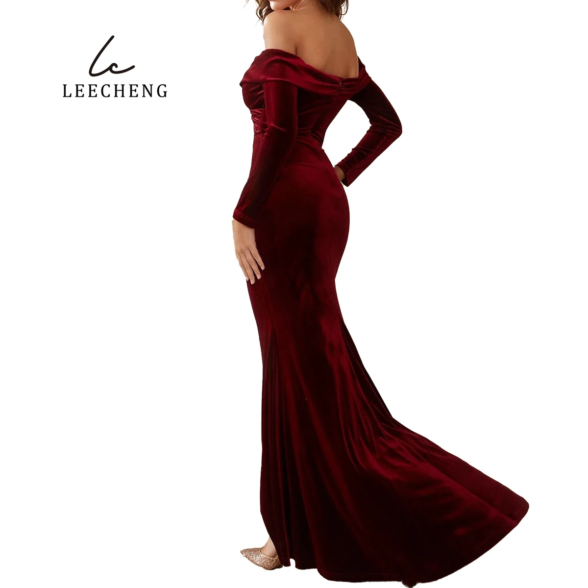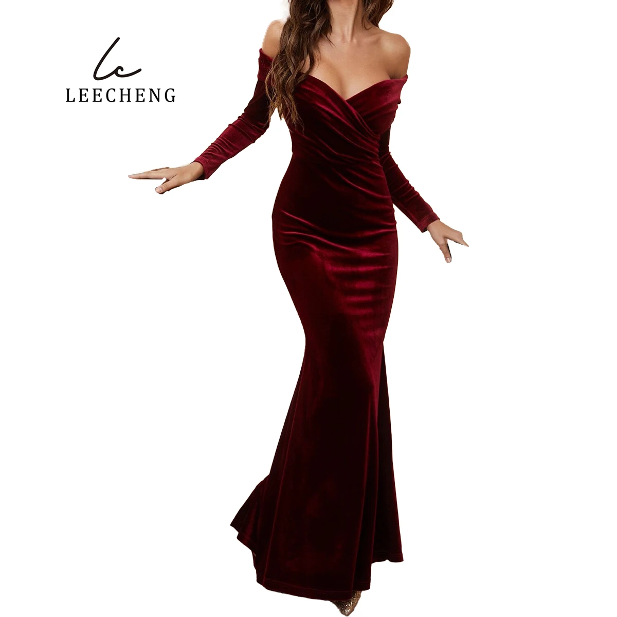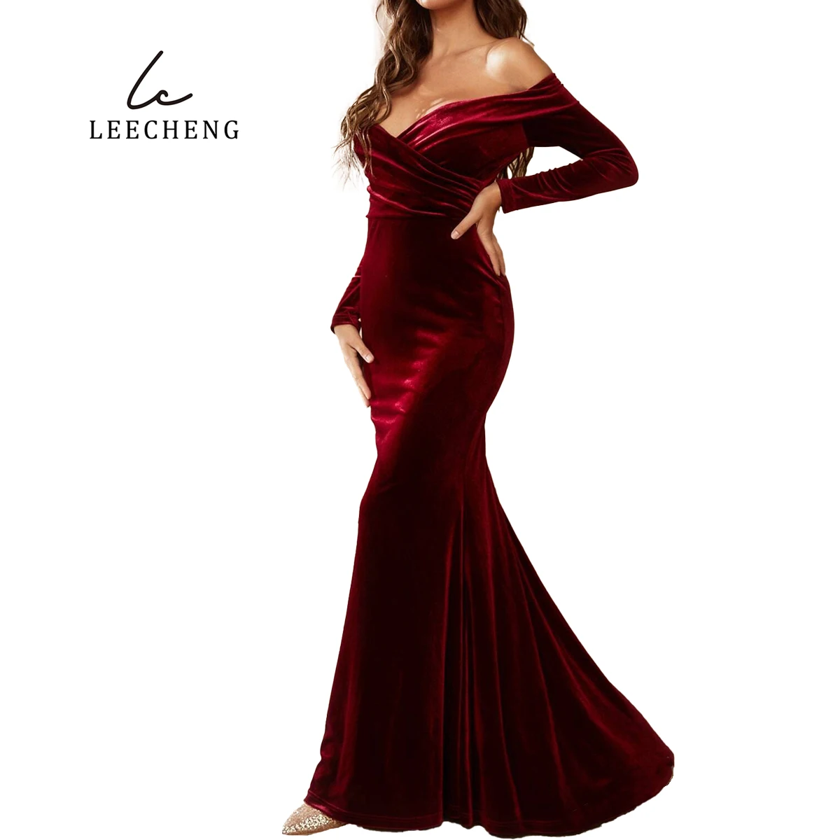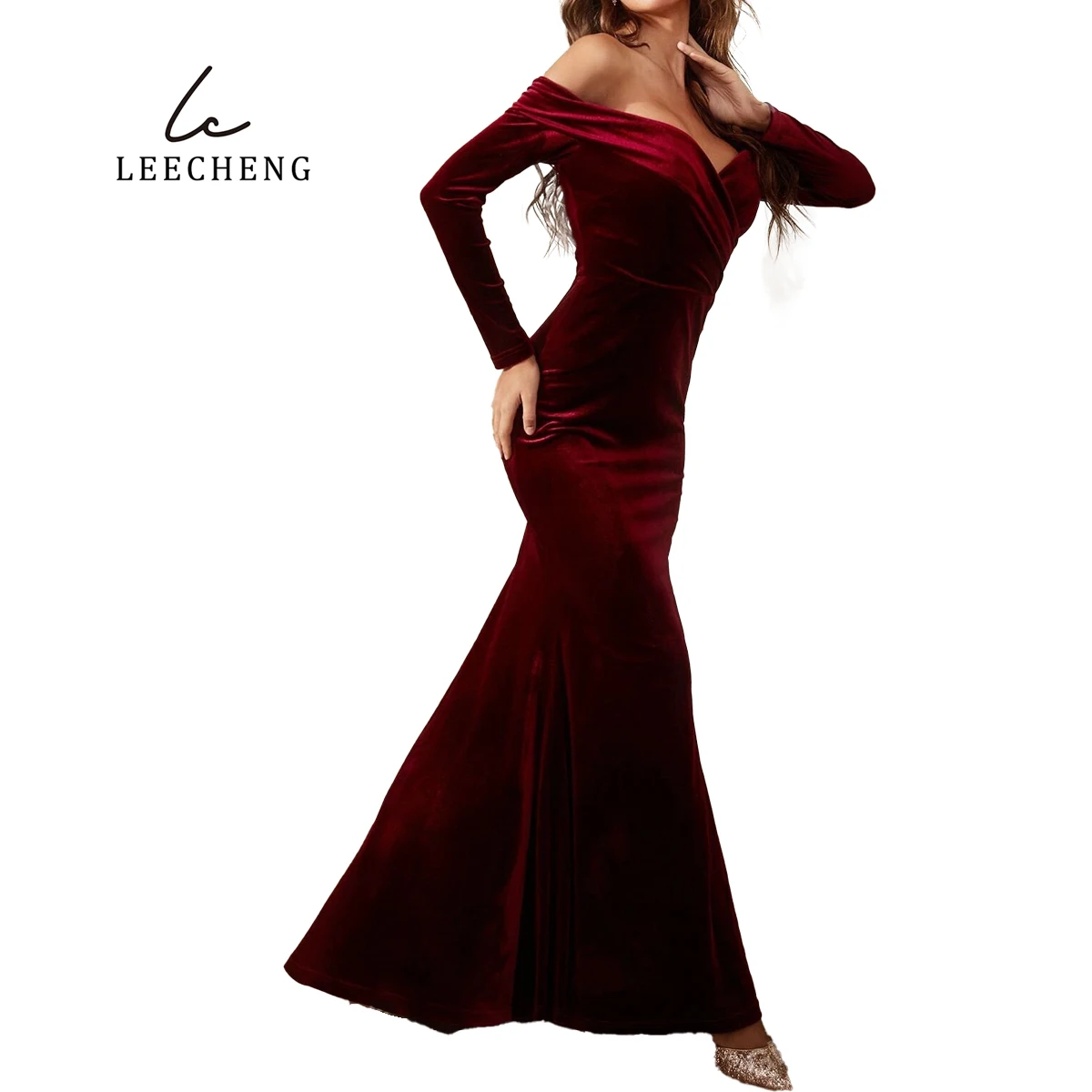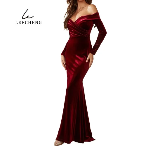 Product Name: Line Shoulder V-neck Wrap Long Sleeve Burgundy Bridesmaid Dress for Wedding Velvet Party Christmas Dress