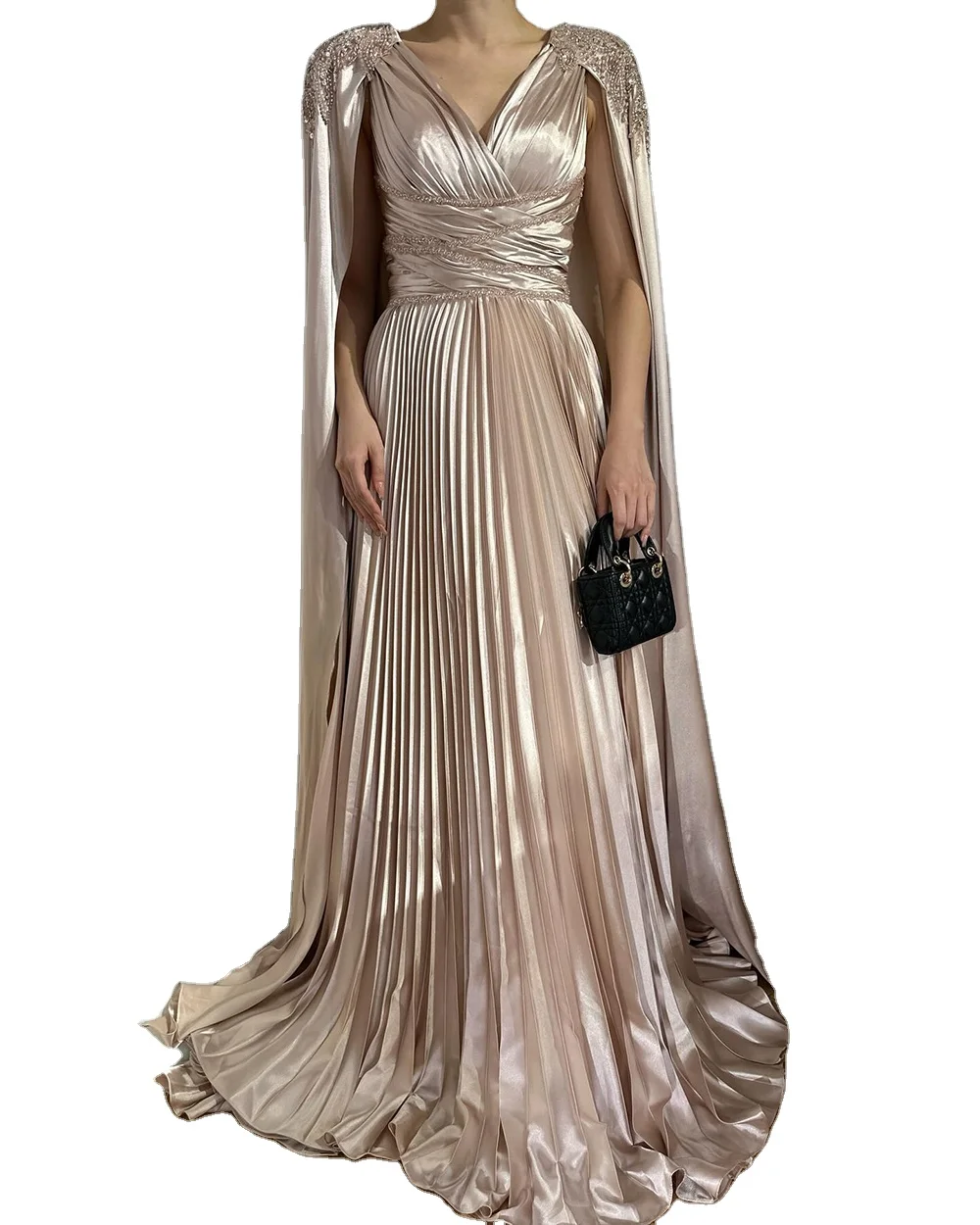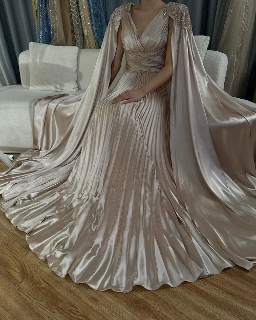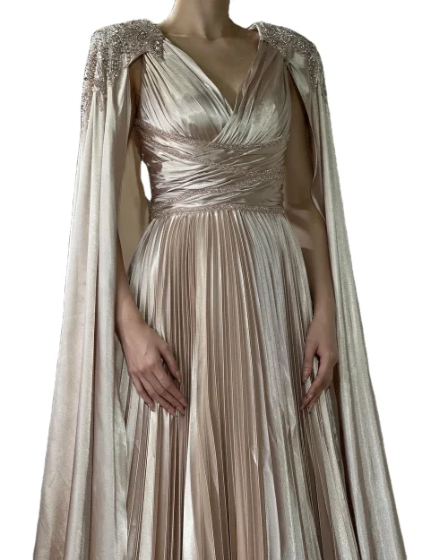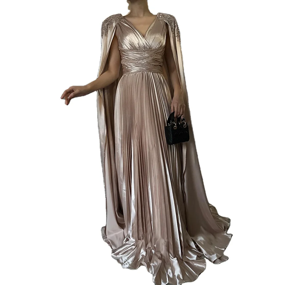 Luxury A-line Evening Gown for Ladies Crystal Rose Gold Elegant V-neck Rhinestone Fur Wedding Party Cape Dress