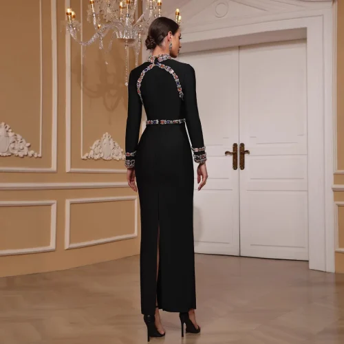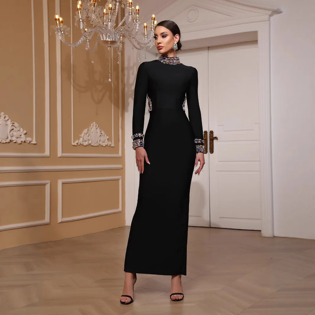 Luxury Black Bandage Beaded Midi Diamond Sequin Decoration Gala Dinner Dresses Gowns Women Elegant