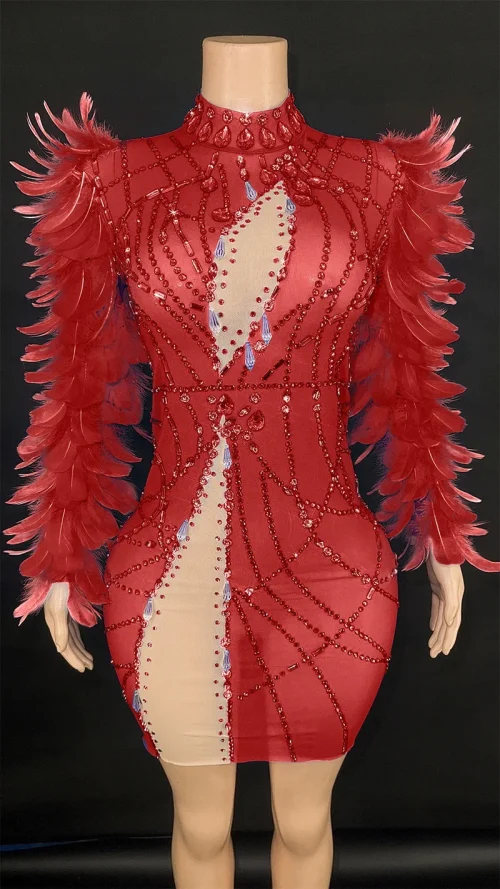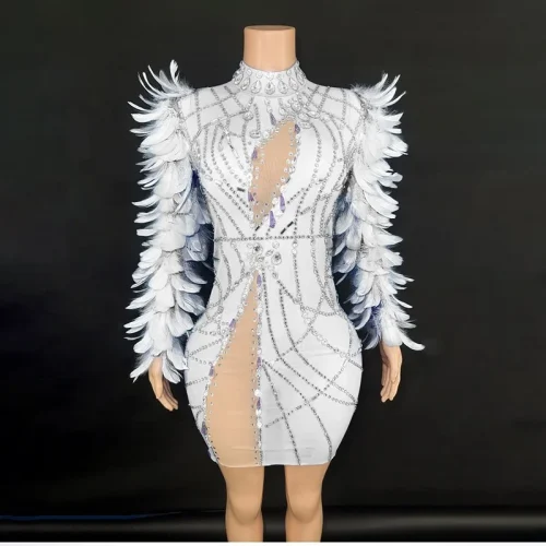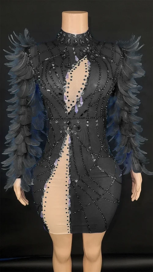 Product Name: Luxury Evening Dresses Sexy Hollow Gorgeous Feather Sleeves Blue Sequin Dress Party Evening Performance Dress