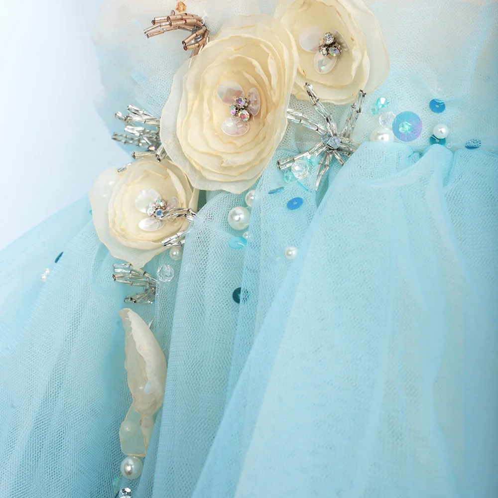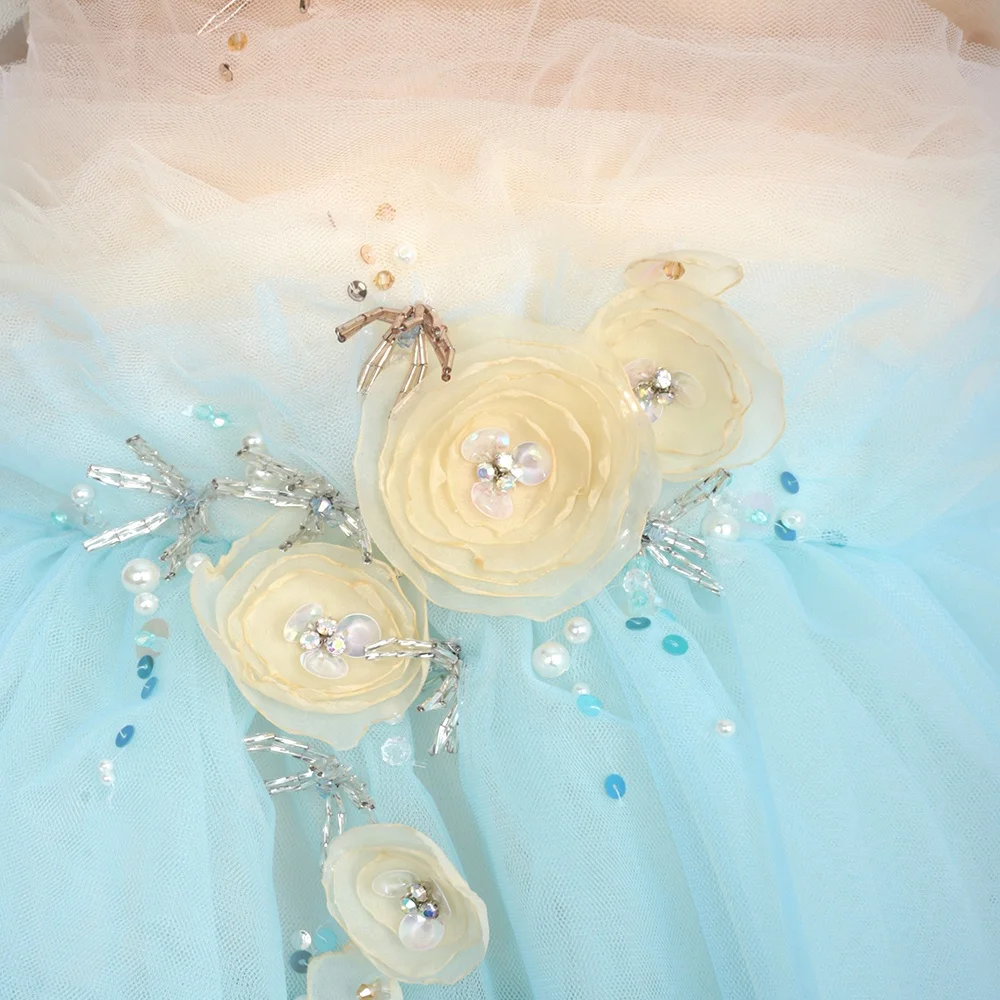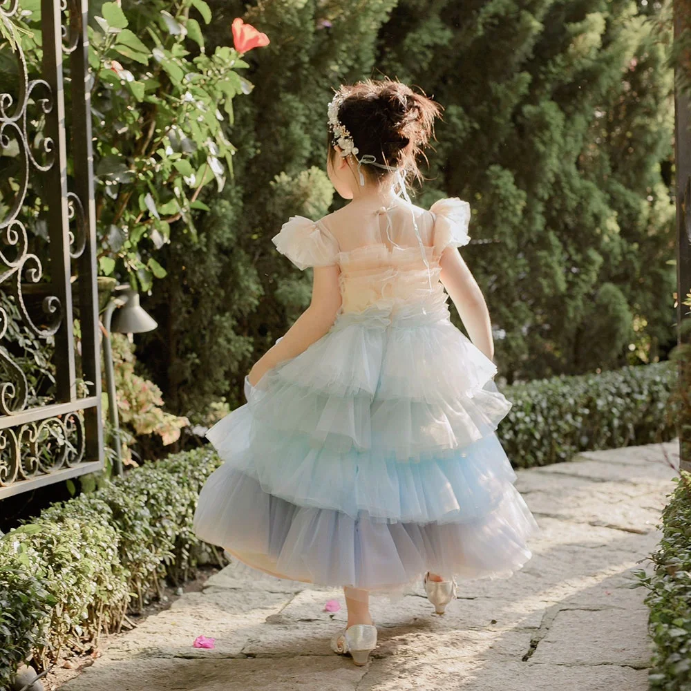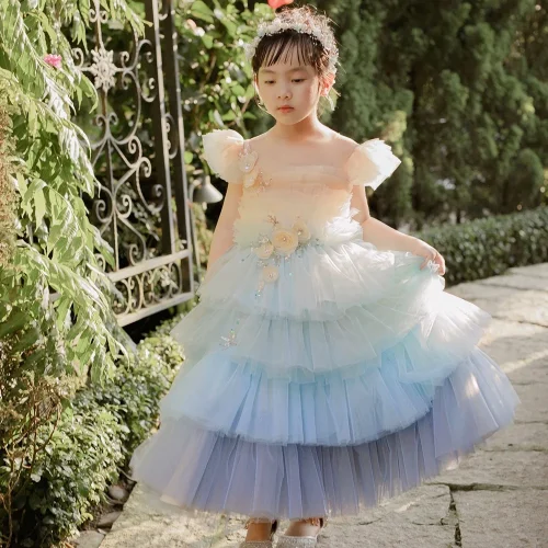 Product Name: Multilayer 3D Flower Beaded Tulle Dress for Baby Girls Blue Ocean with Short Sleeves Princess Style Muriel Dress for Parties