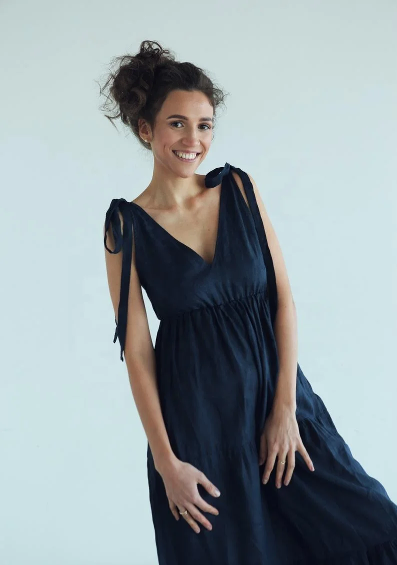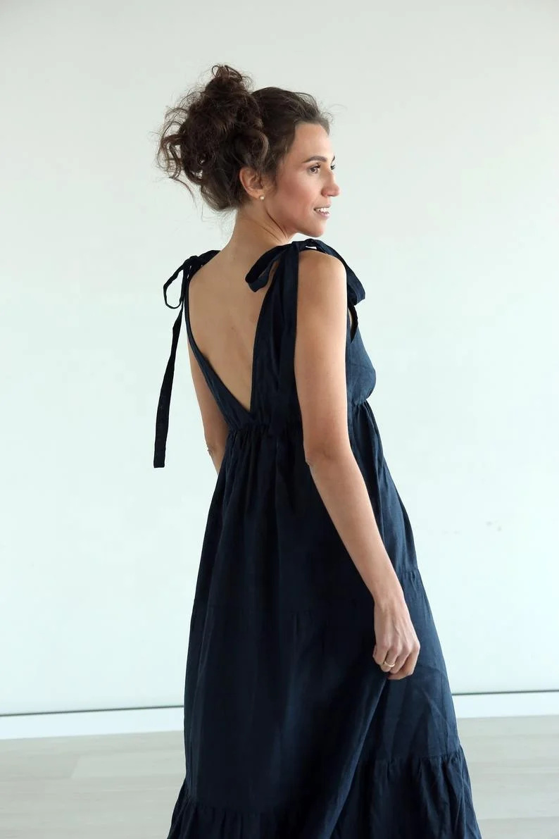 Natural Soft Linen Maxi Dress for Women XS Plus Size Sexy V Neck Front Back Solid Beach Boho Sundress Shoulder Tie Party Wear