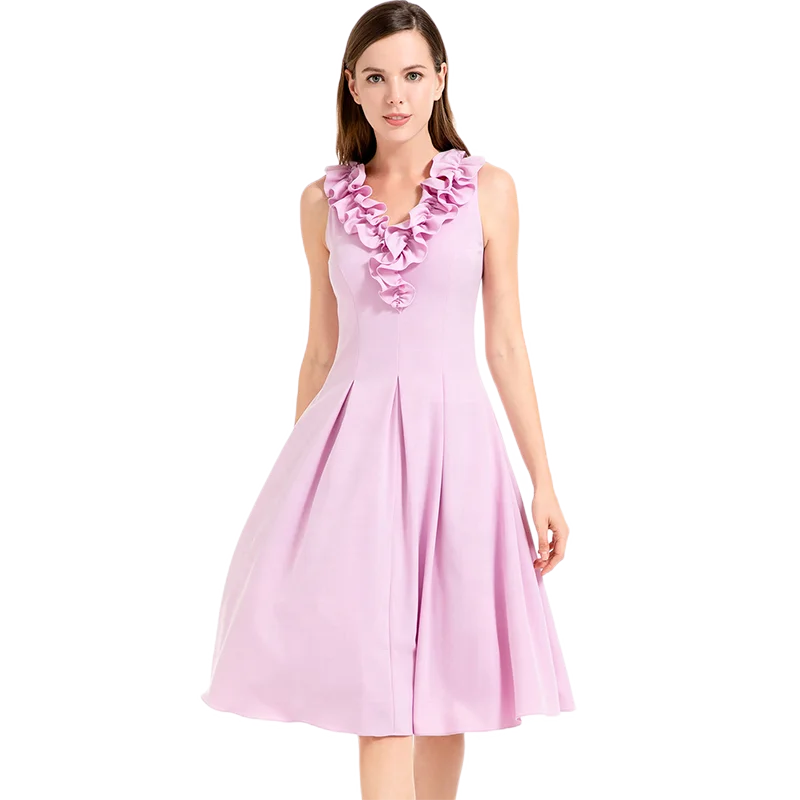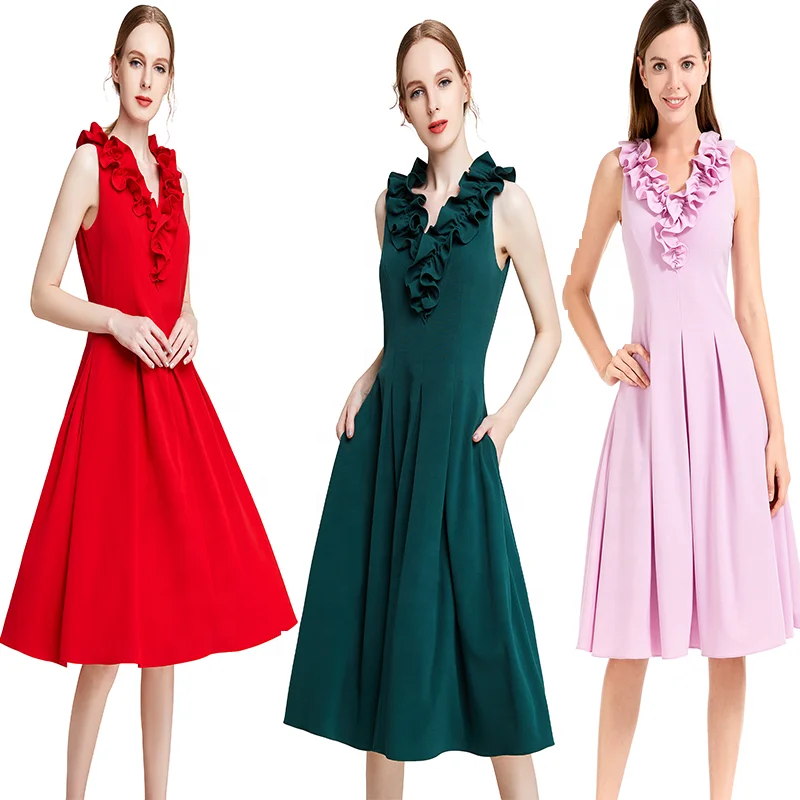 ND004 Odm Solid Sleeveless Ruched Ruffle Midi Party Dress for Women