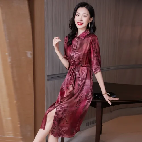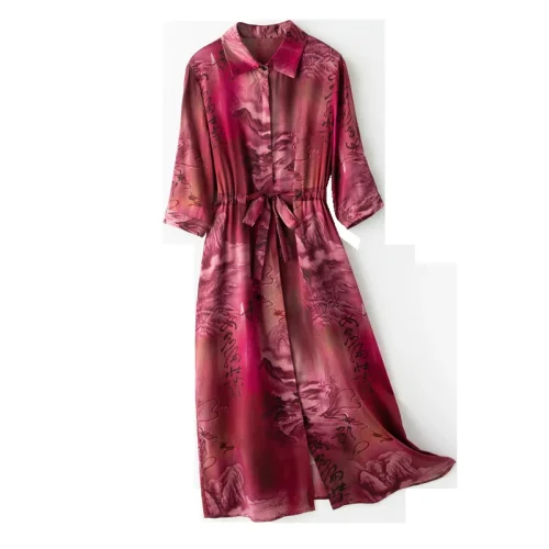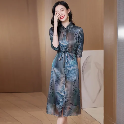 Product Name: New 2025 Chinese Retro Style High-end Ink-wash Printed Silk Shirt Dress Casual Dress