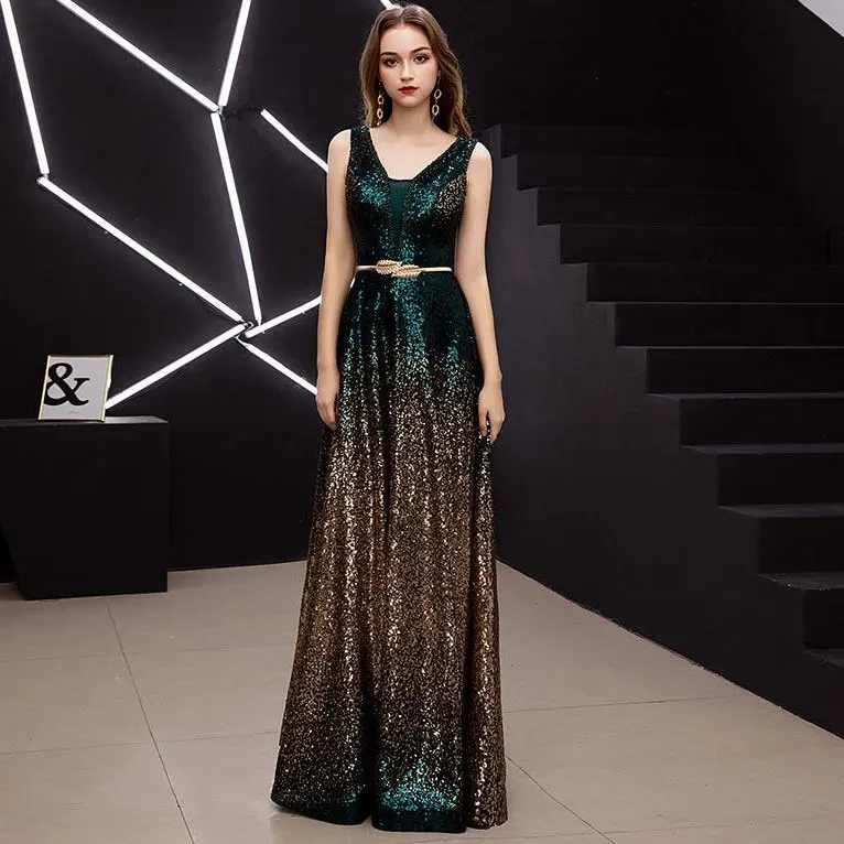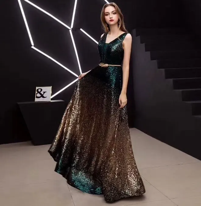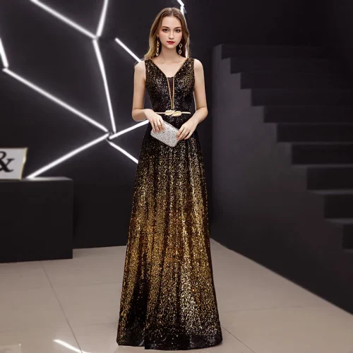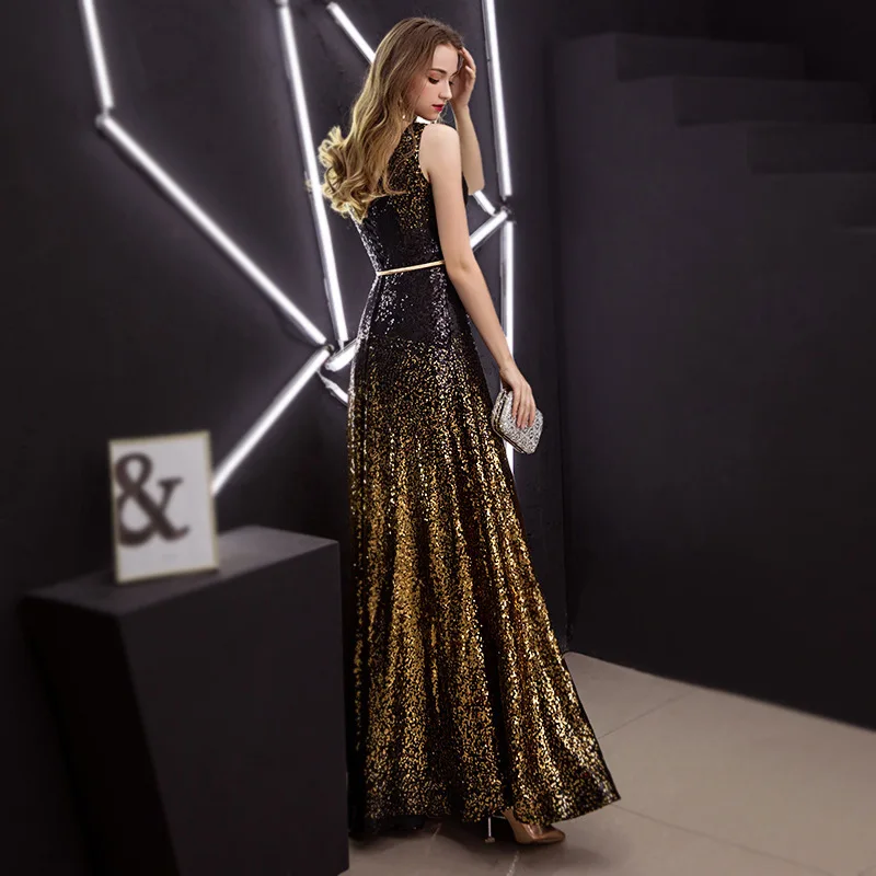 New Arrival Gold Black Slit Neck Sweet Long Bride Club Party Sleeveless Sequins Prom Dresses Floor-length Evening Dress