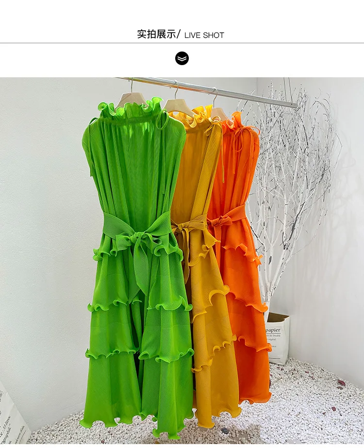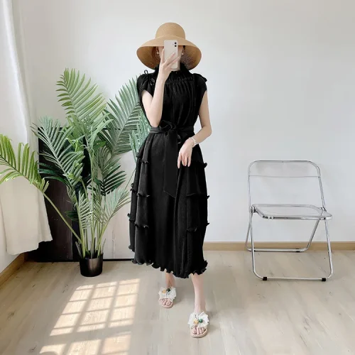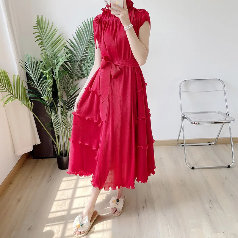 New Clothes Loose Elegant Fungus Lace Belt Pleated Dress Vintage Women Casual Dresses