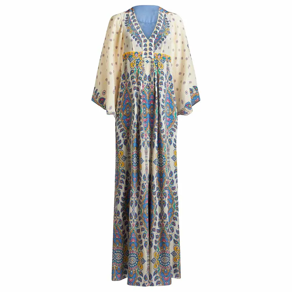New Fashion Elegant Vintage Pattern Discharge Printing V-neck Long Wide Sleeves Maxi Dress