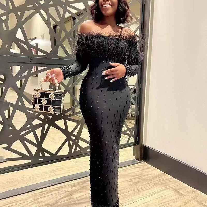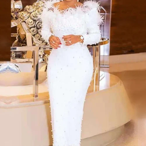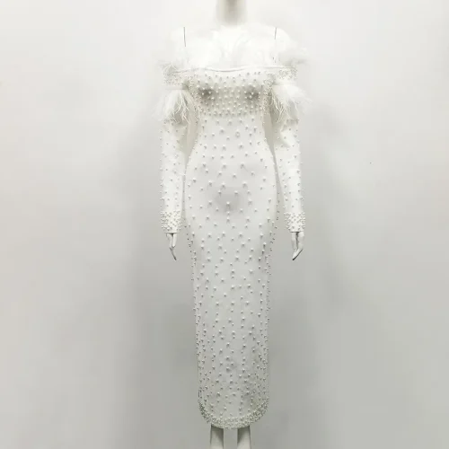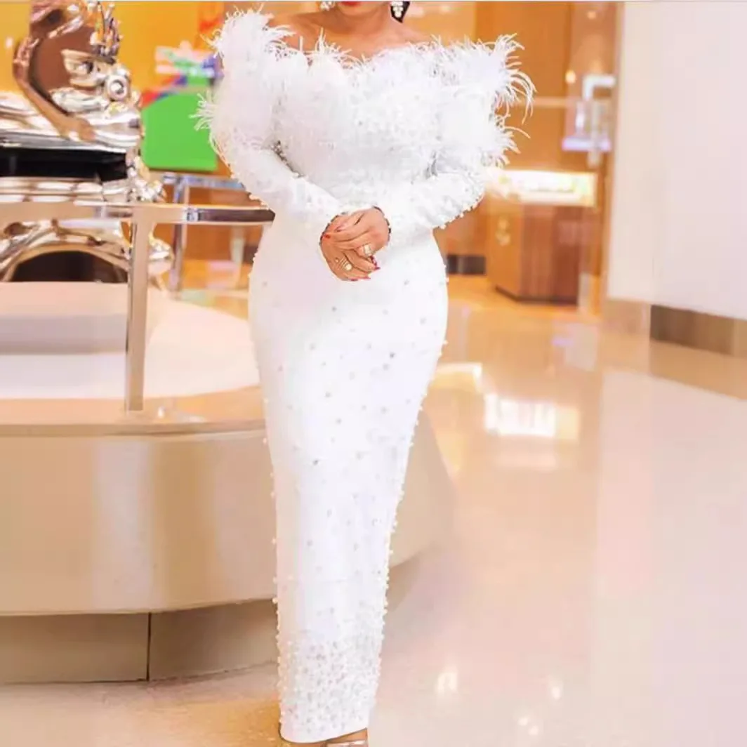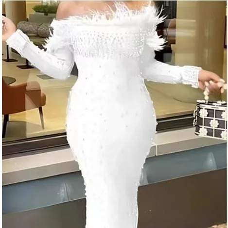 Product Name: New Fashion Feather Long Sleeve Dresses Slim Tight Nail Bead White Party Dress Evening Dresses