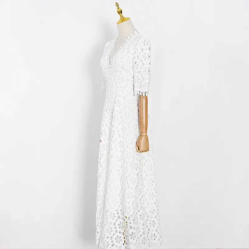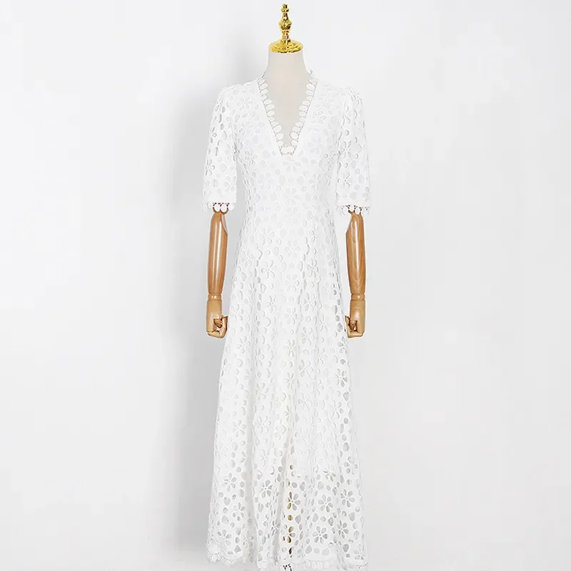 New Femininity French Style Luxury V-neck Half Sleeve White Swing Hook Flower Women Aline Casual Hollow Elegant Lace Lady Dress
