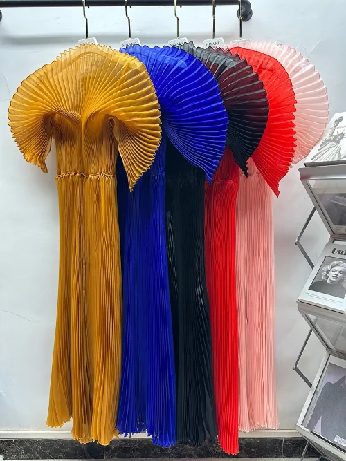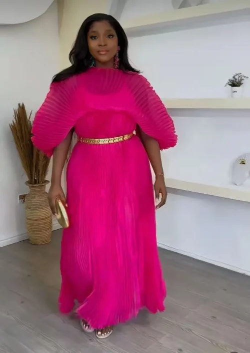 New Fold Plus Size Women Lady Elegant Dresses Solid Color Pleated Sleeved Maxi Dress