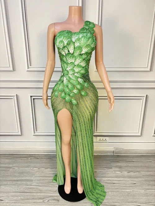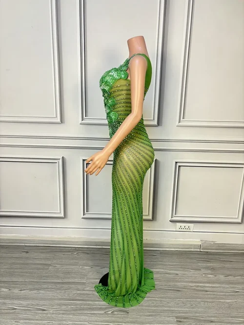 Product Name: New Green Mesh See Through Flower Evening Dresses Rhinestone Birthday Dress Plus Size Women’s Clothing