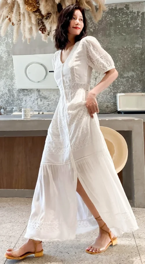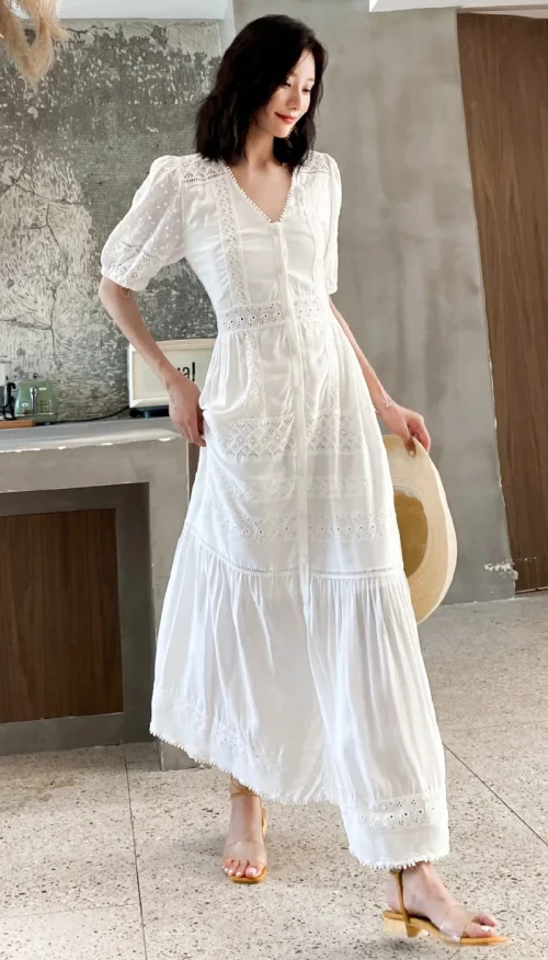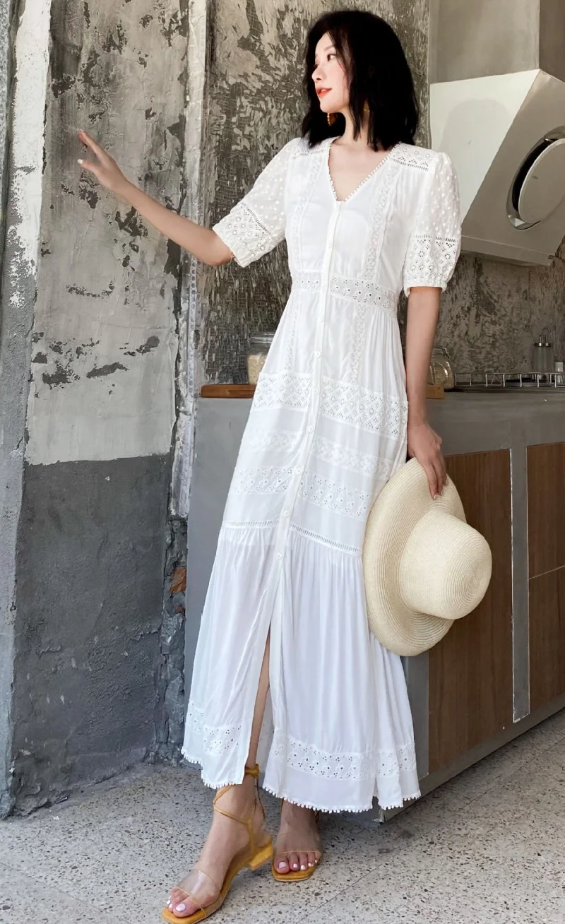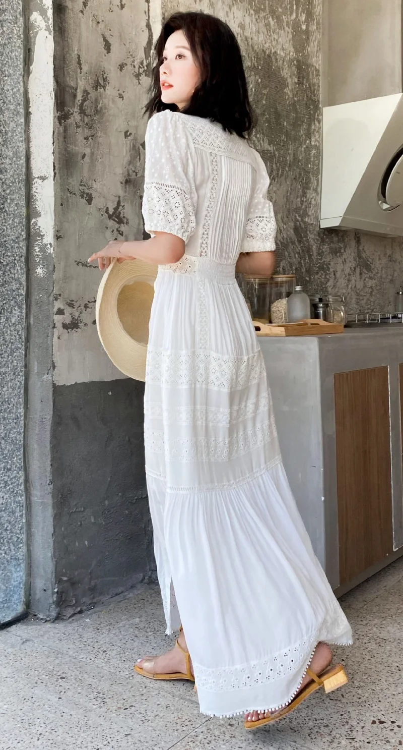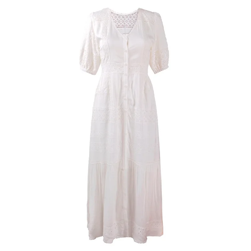 Product Name: New Korean Fashion Long Dress 2023 Summer Ladies V-Neck Hollow Out Embroidery Button Front Short Sleeve Casual Long Beach Dress