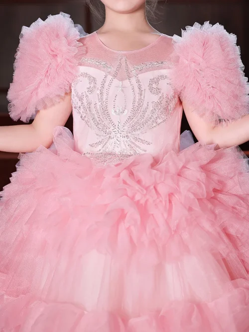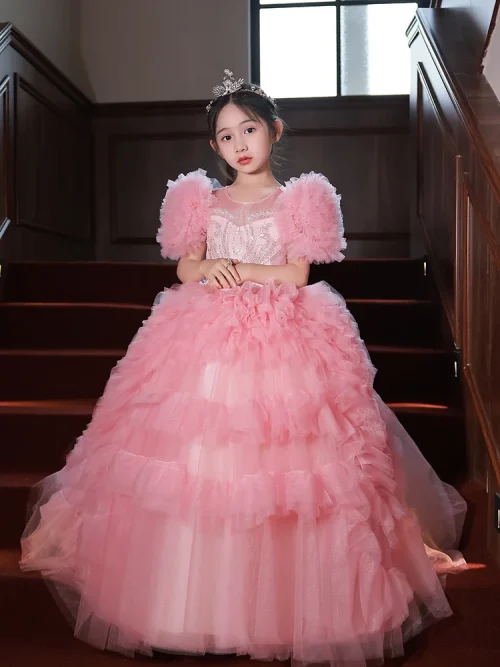 Product Name: New Pink European Style Children Piano Performance Dress Drag Tail Flower Girl Princess Skirt Model Catwalk Dresses