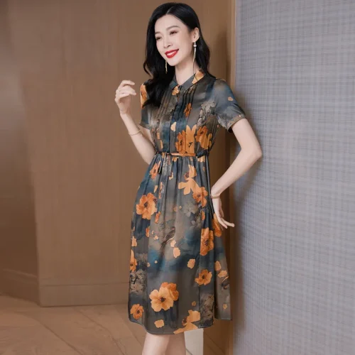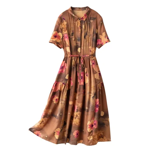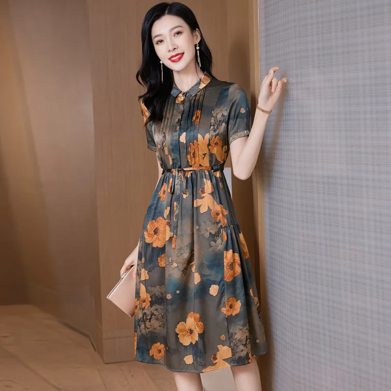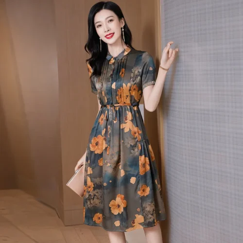 New Retro Floral Printed Silk Dress for Women Casual Style Long Low-Waist with Digital Printing Heavy Washable