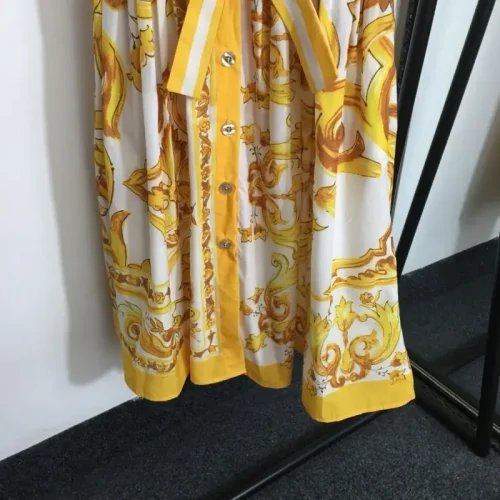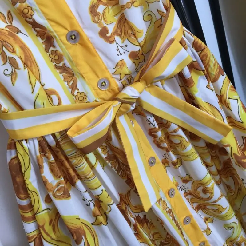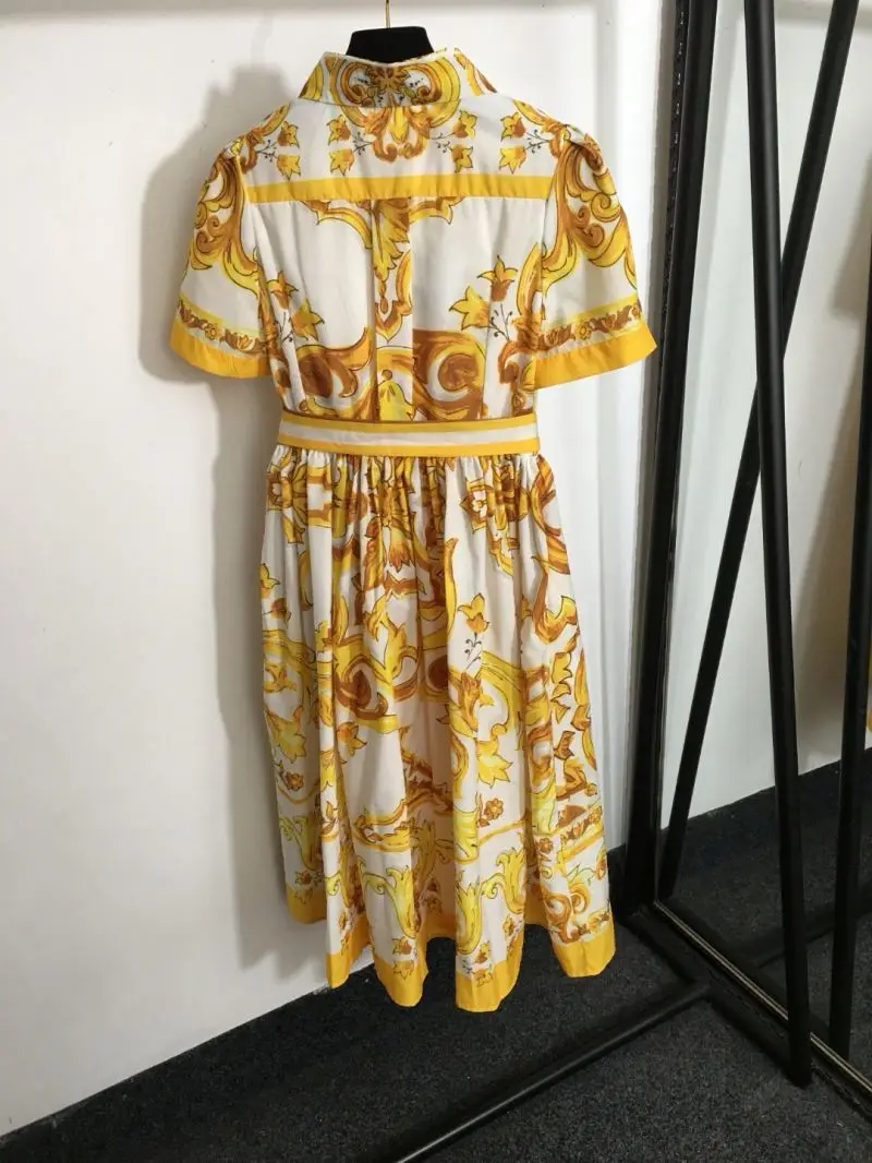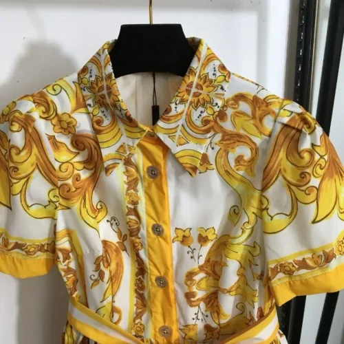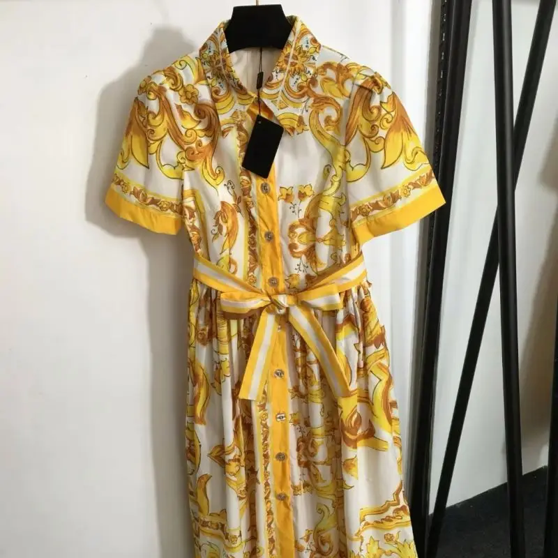 New Retro Patterned Printed Lace up Waist Cinching Short Sleeved Shirt Dress