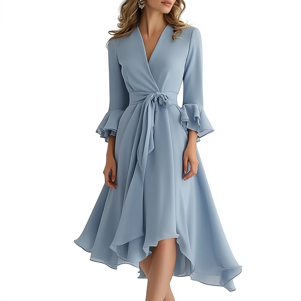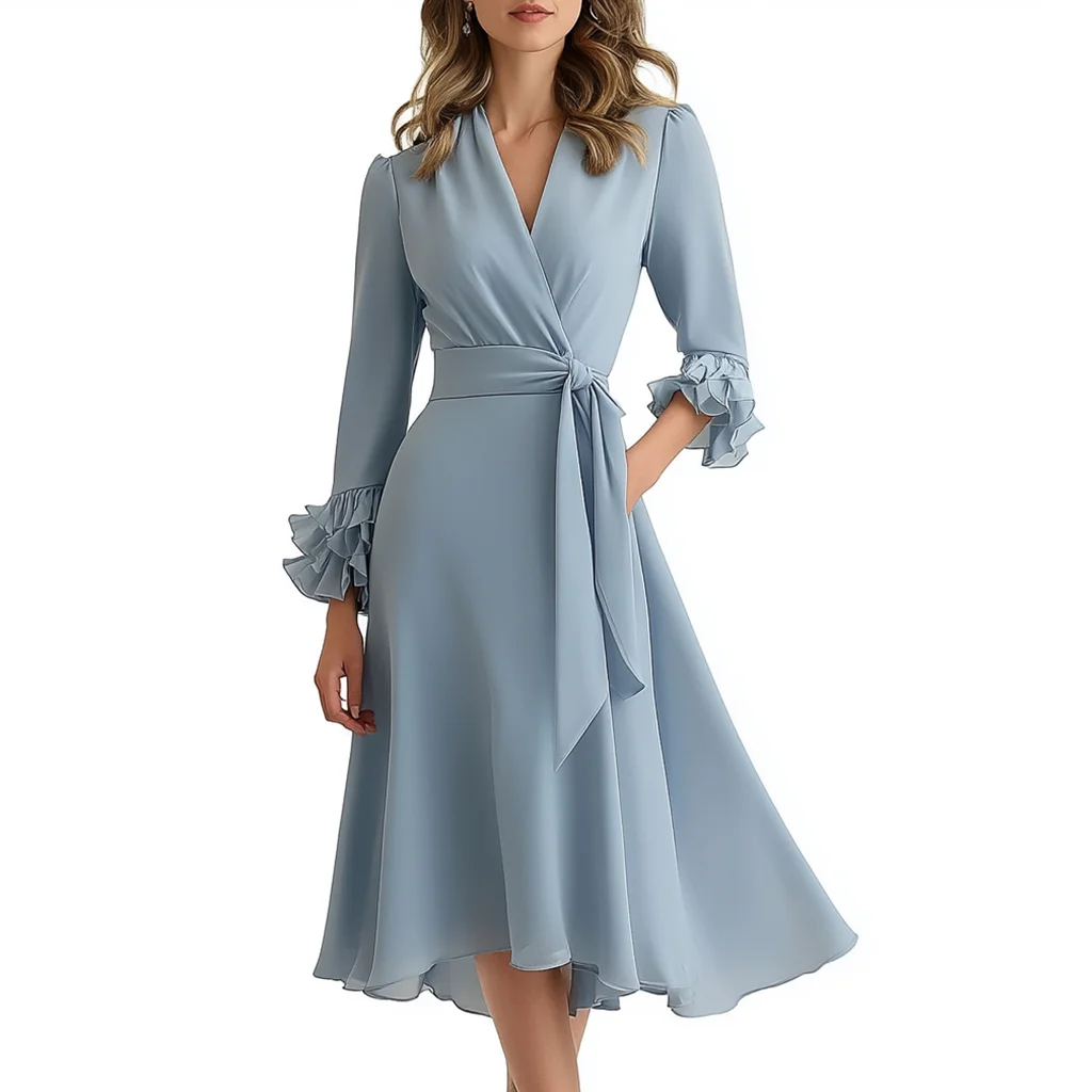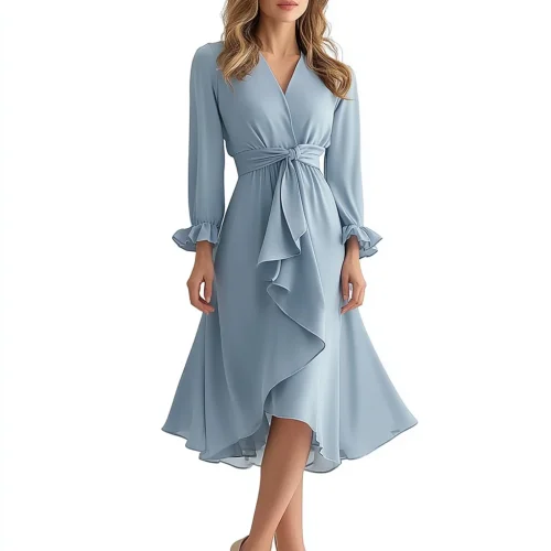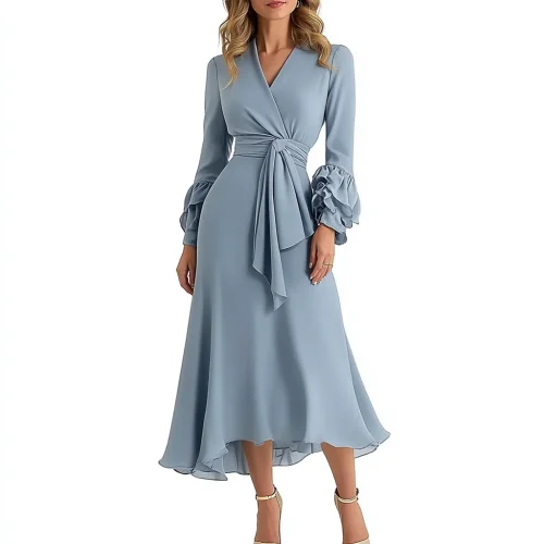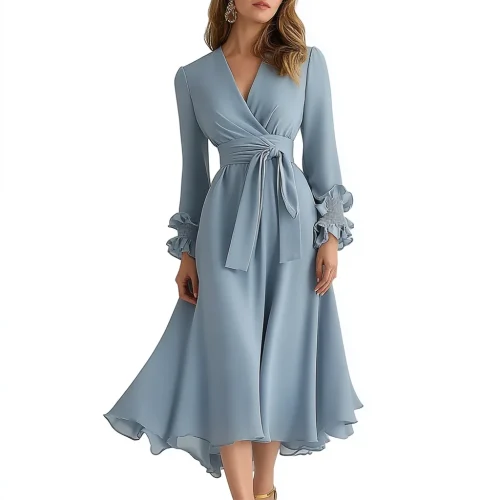 New Style Women Solid Colour Belt Wrapped Blouse Dress Long Sleeve Ruffle Hem Calf-length Woman Casual Midi Dress