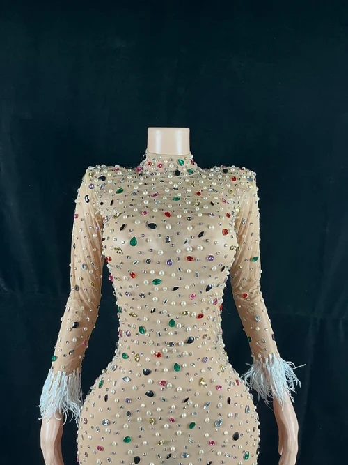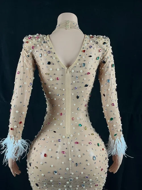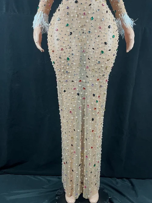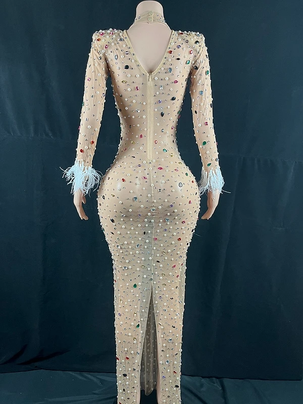 Product Name: New Woman Clothes 2022 Trending Multicolor Flashing Sexy Rhinestone Evening Gowns Feather Cuffs Long Mesh Tight Maxi Dress