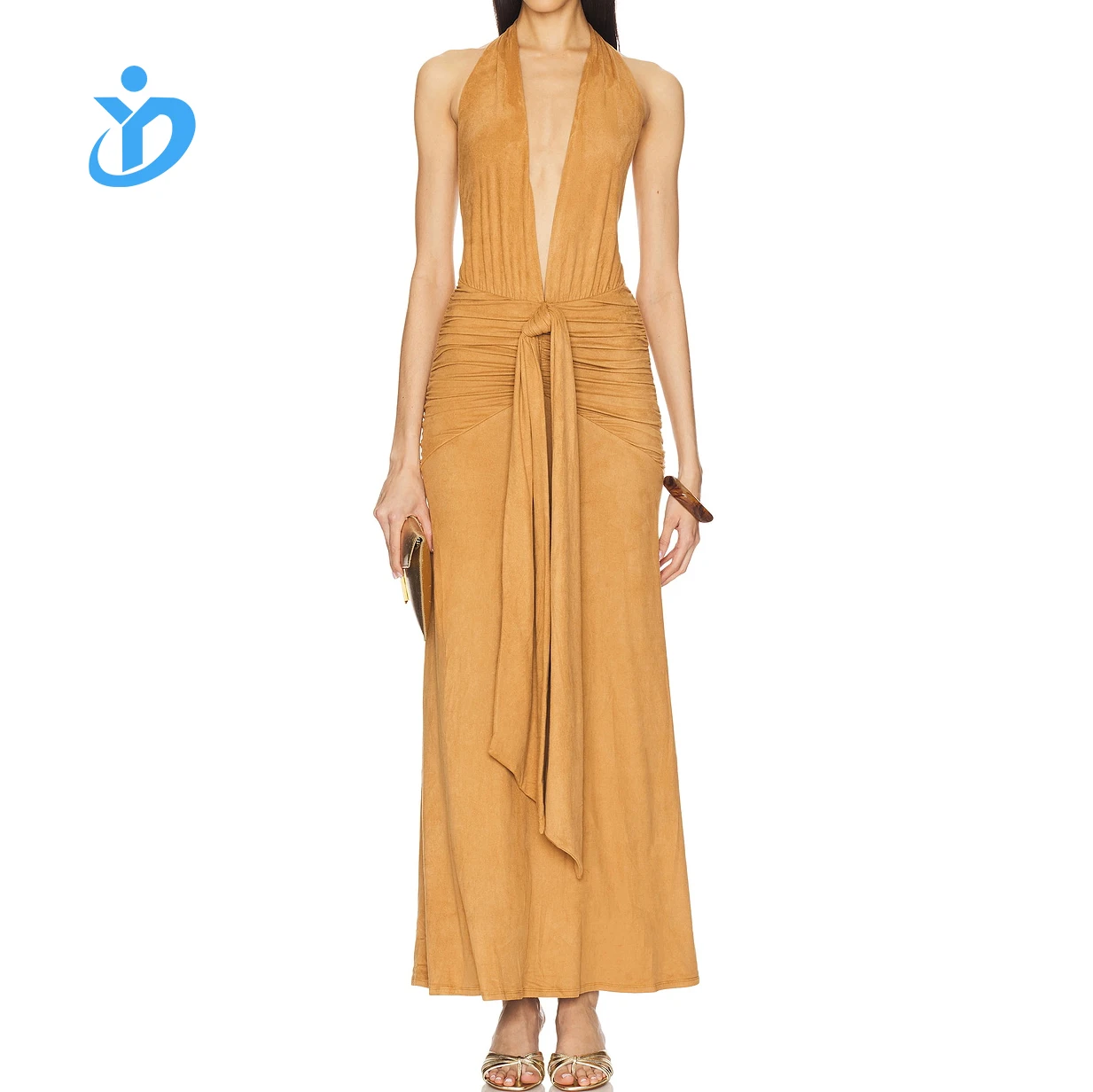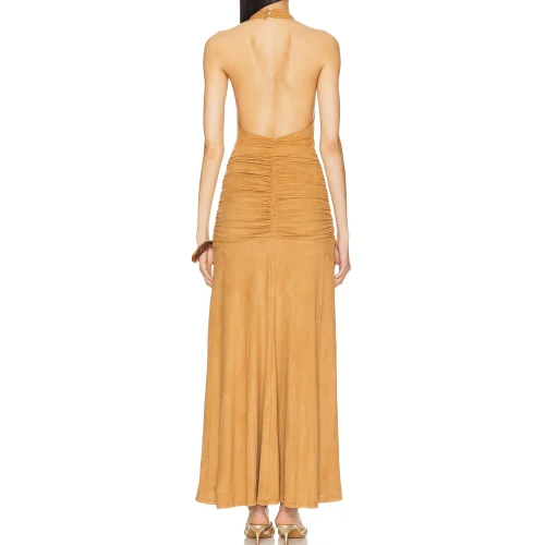 Product Name: New Women Fashion Suede Halter Low V Neck Ruched Waist Draped Sexy Backless Lady Elegant Wedding Party Sleeveless Midi Dress