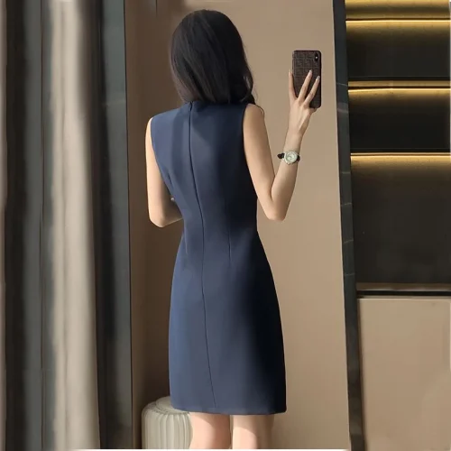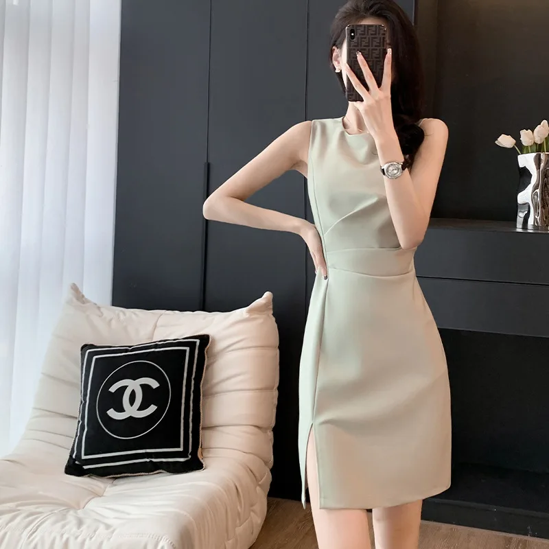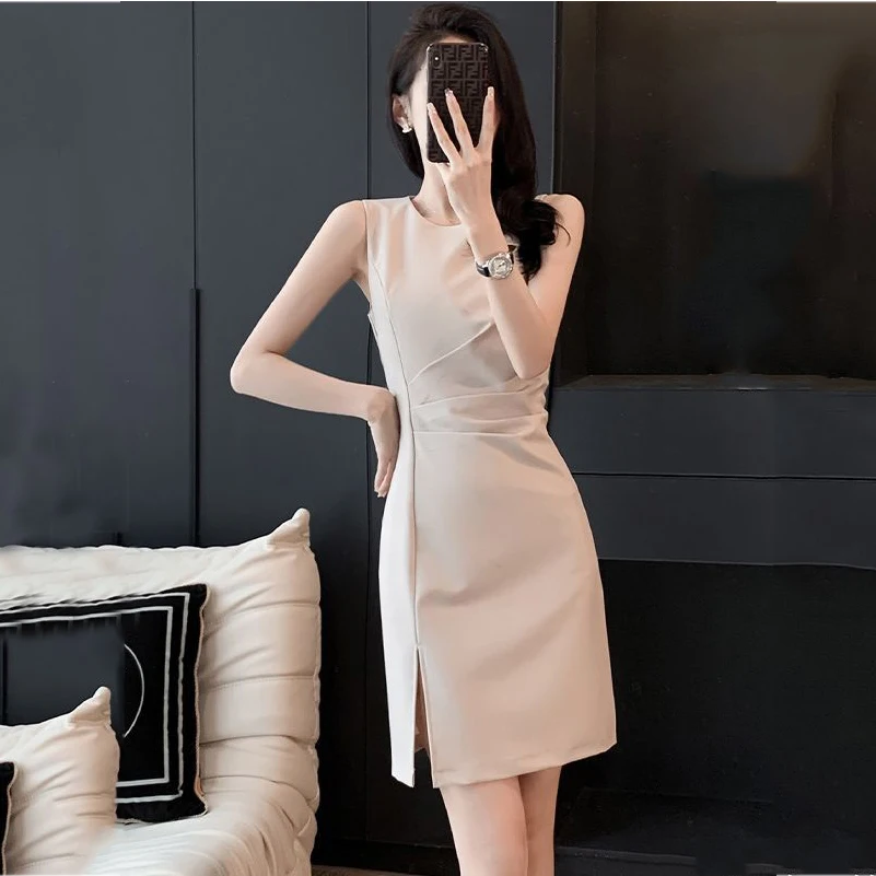 Product Name: Nice Ladies Dress Women Suit Fabric Sleeveless Slit Sundress Knee Length Black Skirt