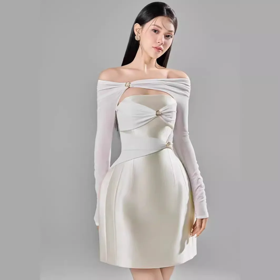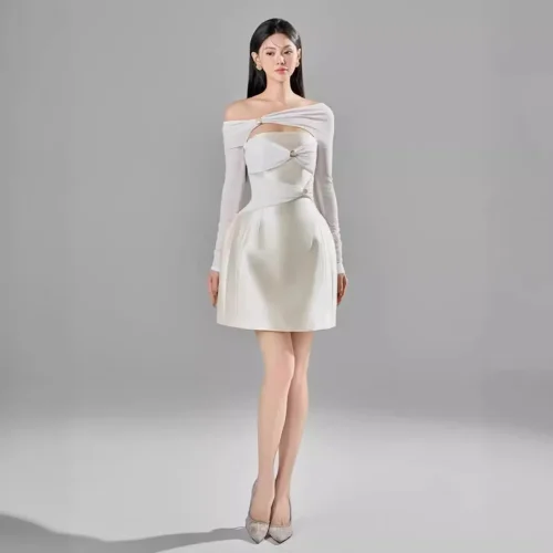 Product Name: Niche Elegant Satin Dress Off-Shoulder V-Neck Waist-Cinching Short Mini Length Casual Style for Office Spring Summer Solid Front