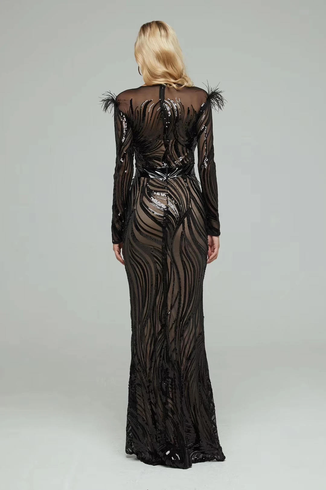 Product Name: Novance F2371 High Quality Bodycon Dress Womens Sexy Business Mermaid Feather Dress See Though Mesh Wedding Party Long Dress
