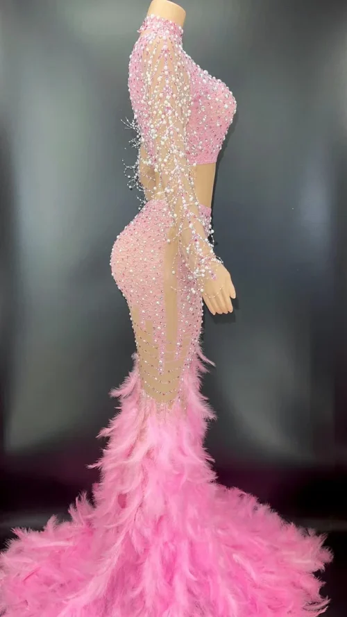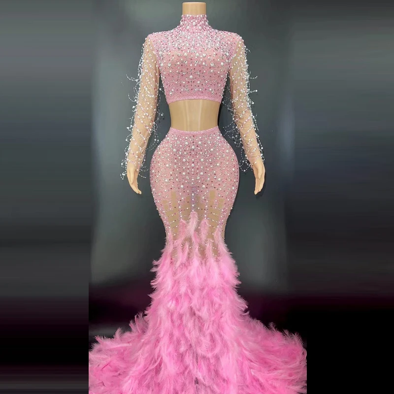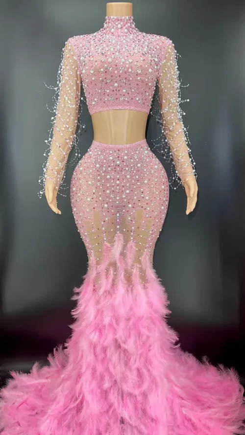 Product Name: Novance Y2369-B Summer Outfits Two Piece Set Luxury Illusion Weeding Evening Dress Shiny Rhinestone Pearl Pink Feather Dress