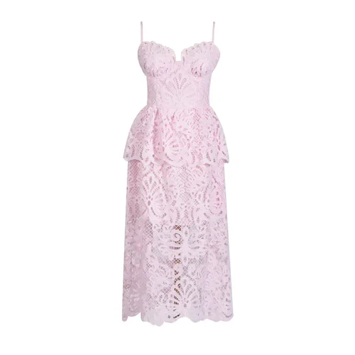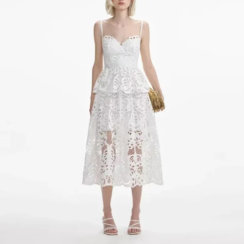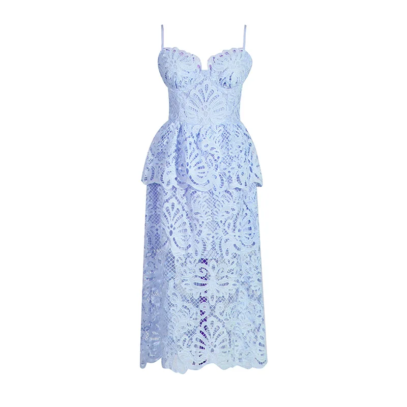 Product Name: Novia Party Dress 2024 Summer Fashion Style Ladies Spaghetti Strap Allover Crochet Lace Embroidery Midi White Pink Blue Dress