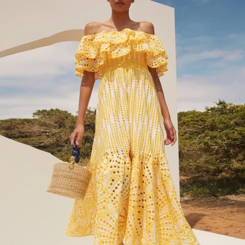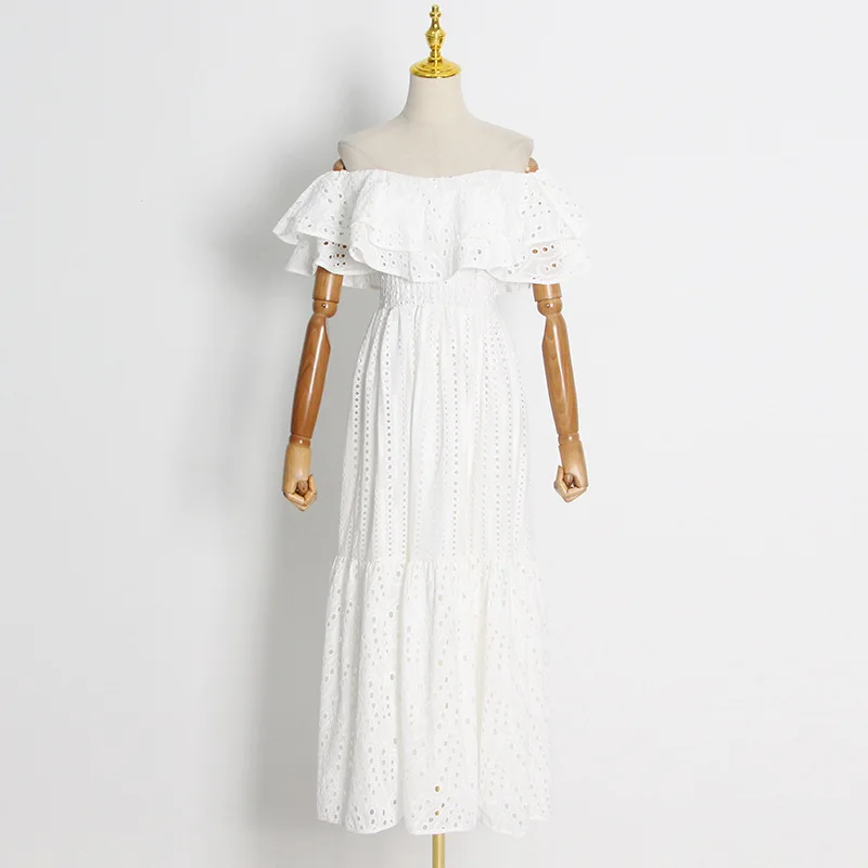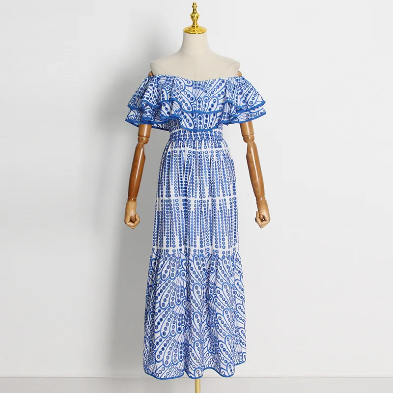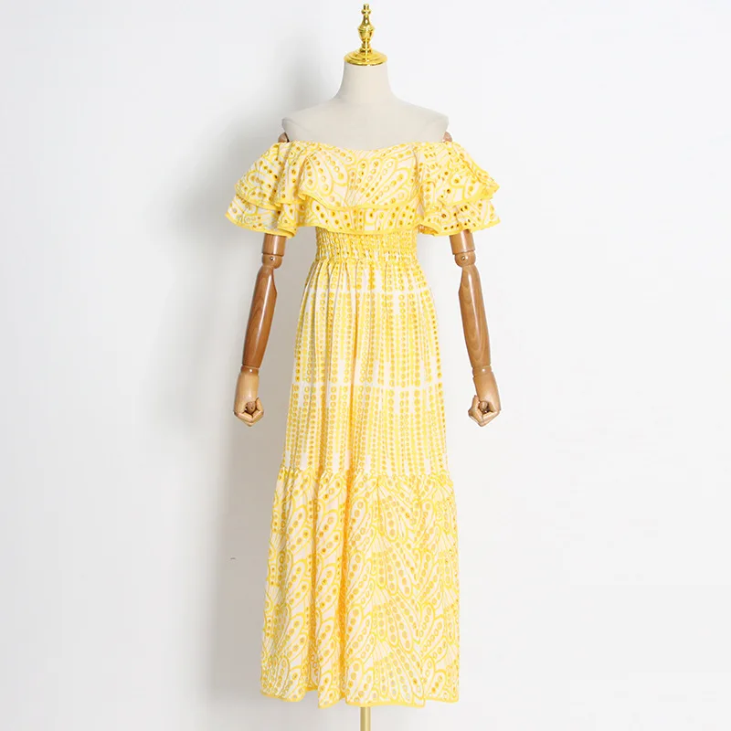 Ocstradevestido Bohemian Sun Dresses Women Casual Summer Double Layer Ruffled Off Shoulder Embroidered Hollow Out Long Dress