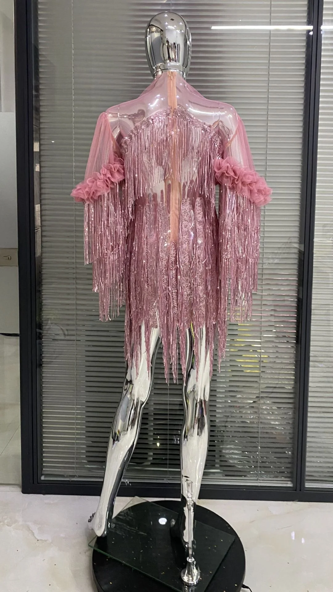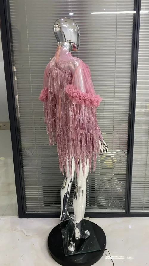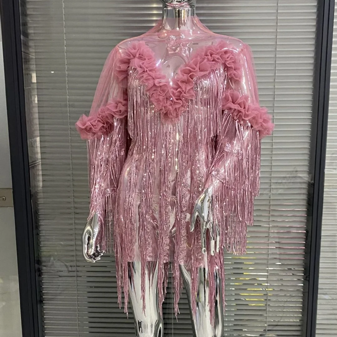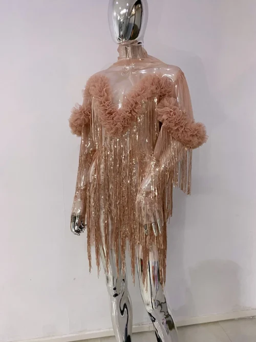 Product Name: OUDINA New Arrival Mesh Tassel Dress Fashion Sequin Short Dress Evening Party Dresses Women