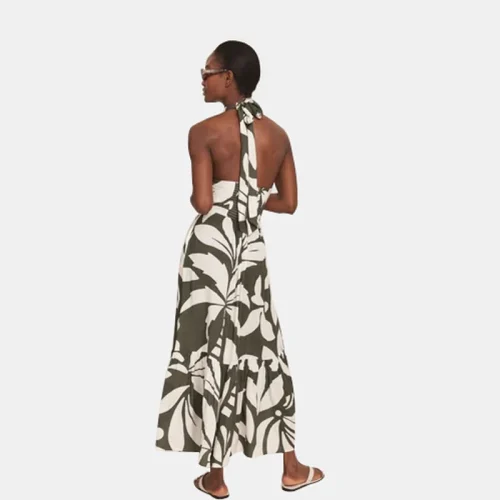 Product Name: Palm Print Halter Maxi Dress for Women with Knot Front Back Tie and Tiered Hem