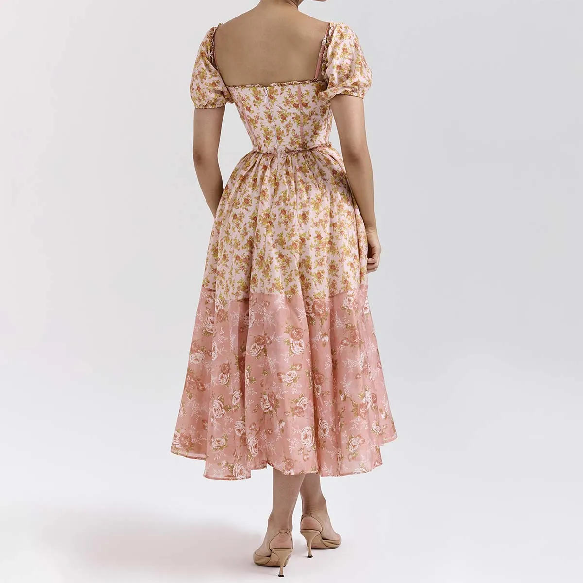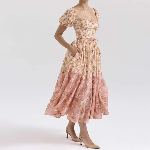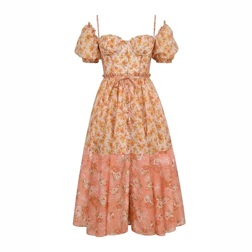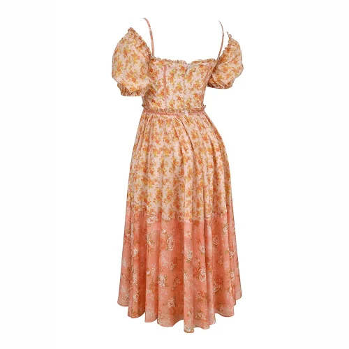 Peach Poppy Print Puff Sleeve Midi Sundress a Fresh and Playful Look Women Clothing
